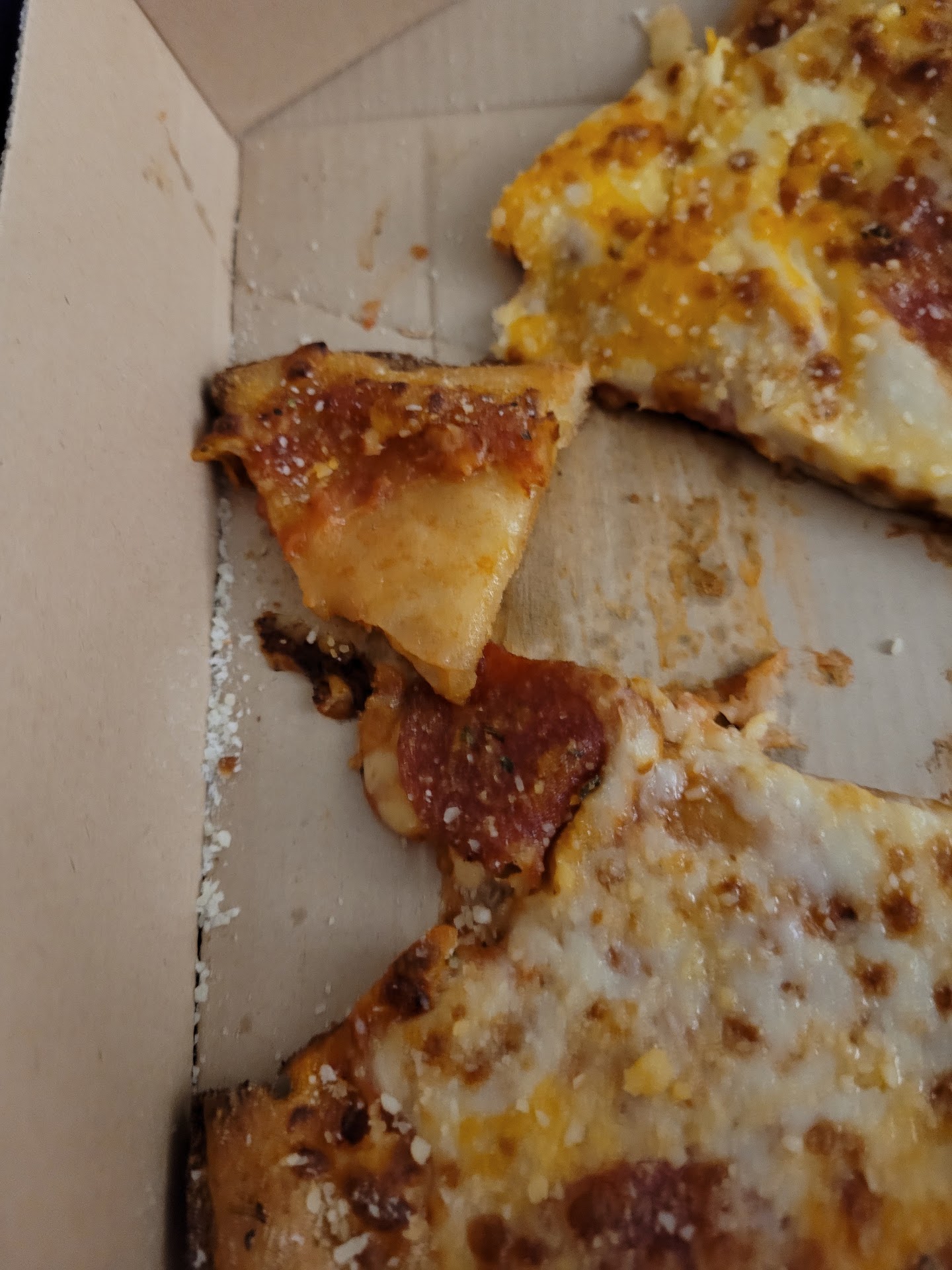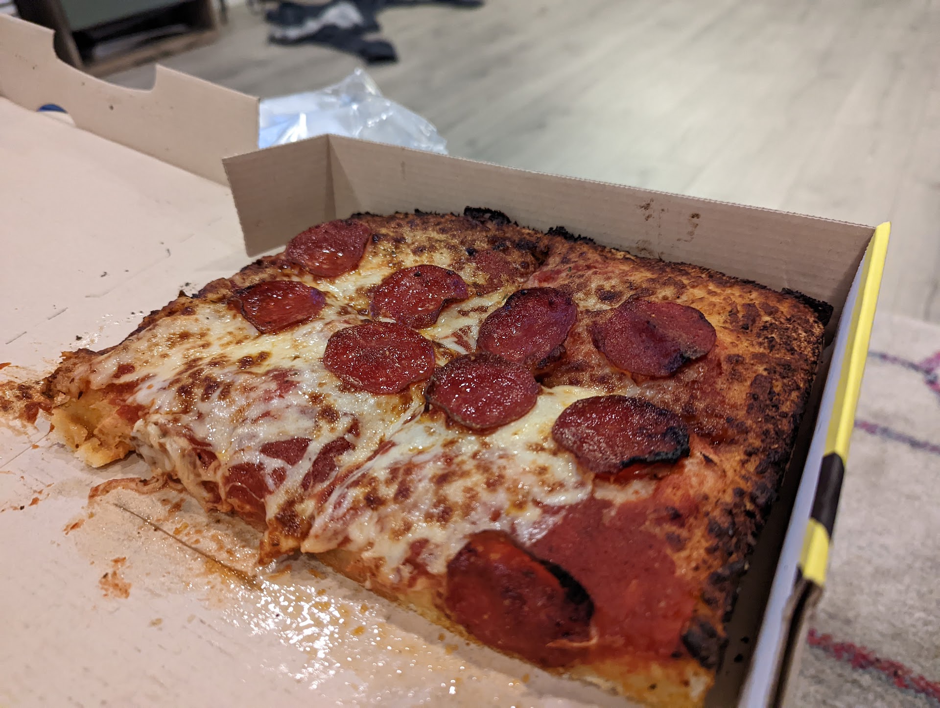 Beyond that, let's talk this take on "deep dish". Deep dish, especially this Detroit style is supposed to have cheese... and this pizza felt like it had about half the cheese it seemed like it was supposed to have. Also had about half the toppings it seemed like it should have, but don't worry, if you like extra sauce and pizza you have to recut yourself, you will love it.