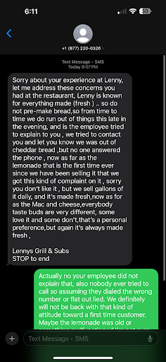 Read moreNormally the service and food at the lenny's in clinton is good but on 11/7/2018 my food was terrible and the manager was very rude. The Philly steak sandwich was not fixed to my satisfaction. Not enough of anything on it. When I requested my money back i was told no because she wasn't going to waste money on a sandwich that was fixed right in her eyes and I can't have my money back. I accepted the sandwich and when I got home and ready to eat it, there was a long string of hair on it. I will not be eating there again the manager is very very rude and hateful. If rather...