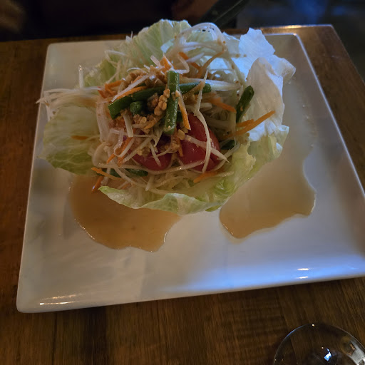 Read moreWe stopped in for dinner on a Friday evening before 6 pm. We didn't have a reservation for 2 people but were seated right away. However, it was a full house by 6:30pm, so I recommend reservations if you're planning ahead. Also, when the place is full, it can be a tad loud as the space is small and tight. We brought a bottle of wine, and the waitress opened our bottle and brought two glass out with our waters and menus. We ordered the papaya salad, tom kah soup, and we shared a whole fish with curry sauce (pla chu chee) and everything was amazing. The fish was a branzino, partially filleted, fried till crispy, mostly boneless, and served atop a decent amount of veggies, but could have used a little more of that delicious curry sauce! The soup was refreshingly tart and lemony. The papaya salad had a nice, fresh crunch and sweet and sour flavor. If you like rice, the portion that comes with the fish is a bit small, so I would order an additonal bowl as a side. Service was very quick and all three of our dishes were brought out together within 15 minutes of ordered. Market price for the fish was $32. Great service, food, atmosphere, and presentation overall. Would love to come back and try...