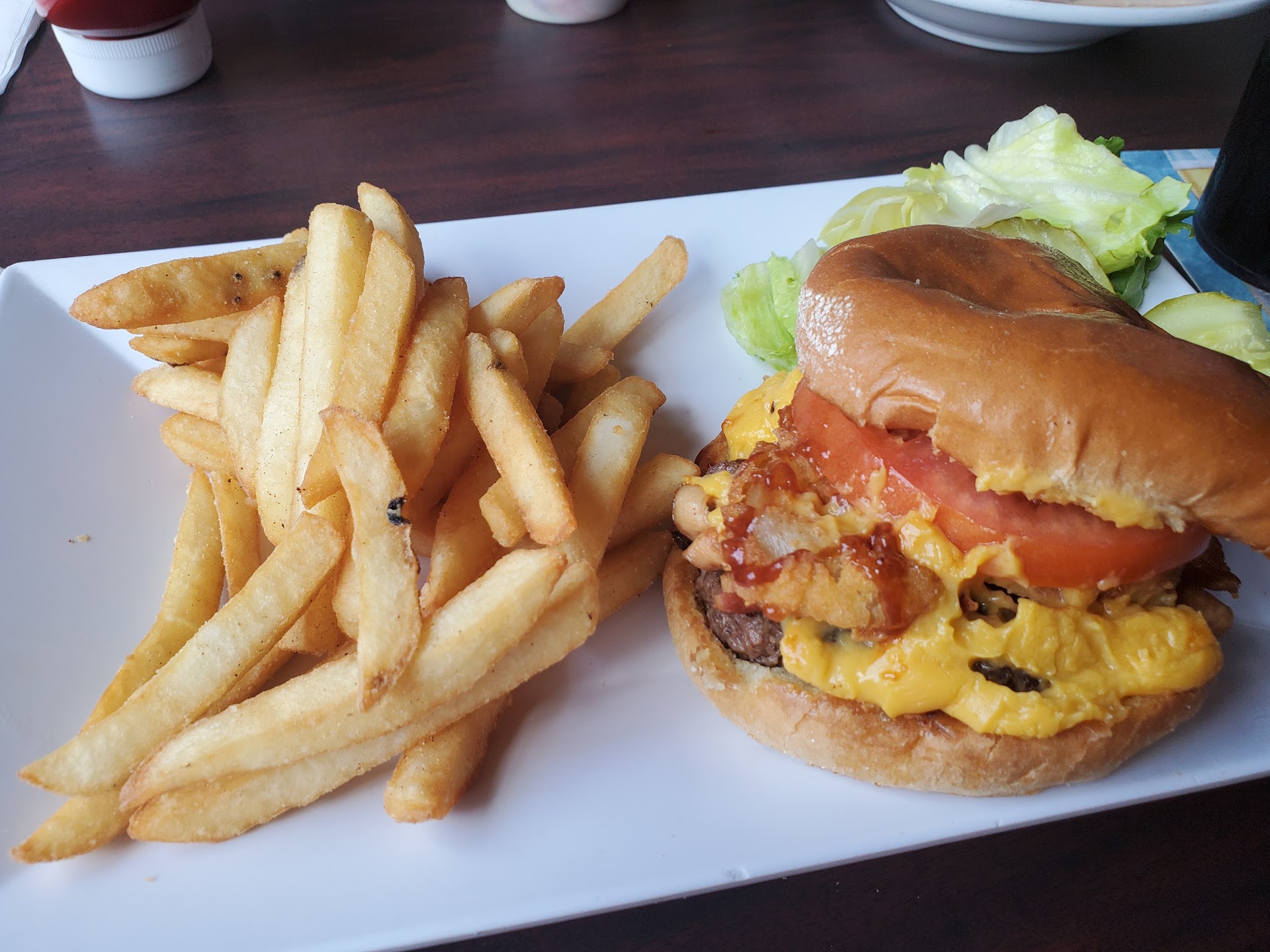 Three of us went there for lunch yesterday. The Celtics game was on but not very crowded lots of empty tables. Good atmosphere. One of the bartenders was our waiter too. Every question was met with confusing answers. Do you have an IPA? Yes but the Taps are low on gas. (No bottles no cans no options ?) when he came back with the two other beers for my friends he had my Wormtown. Excellent. Sweet waffle fries are they made with sweet potatoes? He said “we can make them with sweet potatoes if you’d like”. What? We put in our order for them and they didn’t show up for about 25 minutes so I got up saw him chatting with some patrons and asked him if he knew where our waffle fries had gone to and he said “let me go check” when he returned to the table he said “wow look at that you get what you ask for they just came up.” But in fact they were lukewarm because they had obviously been sitting in the kitchen for quite a while. My friends hamburger was overcooked my steak tips were over cooked and when we gently said so when he asked “how is everything” he said “well it’s a good thing I’m not a cook” and turned on his heel and went back to tending bar. We looked at each other like did that just happen? My friend commented then cook everything medium if you’re not gonna care just cook it medium. I never blame a waiter or waitress for improperly cooked food. Ever. It’s not their job. But when food is cold because you didn’t pick it up and when food is prepared wrong and when you ask is it OK rather than offer a helpful suggestion to try to remedy the problem, you simply walk away like hey it’s not my fault, it’s yours, then I don’t think he gets a good review and I don’t think they get a...