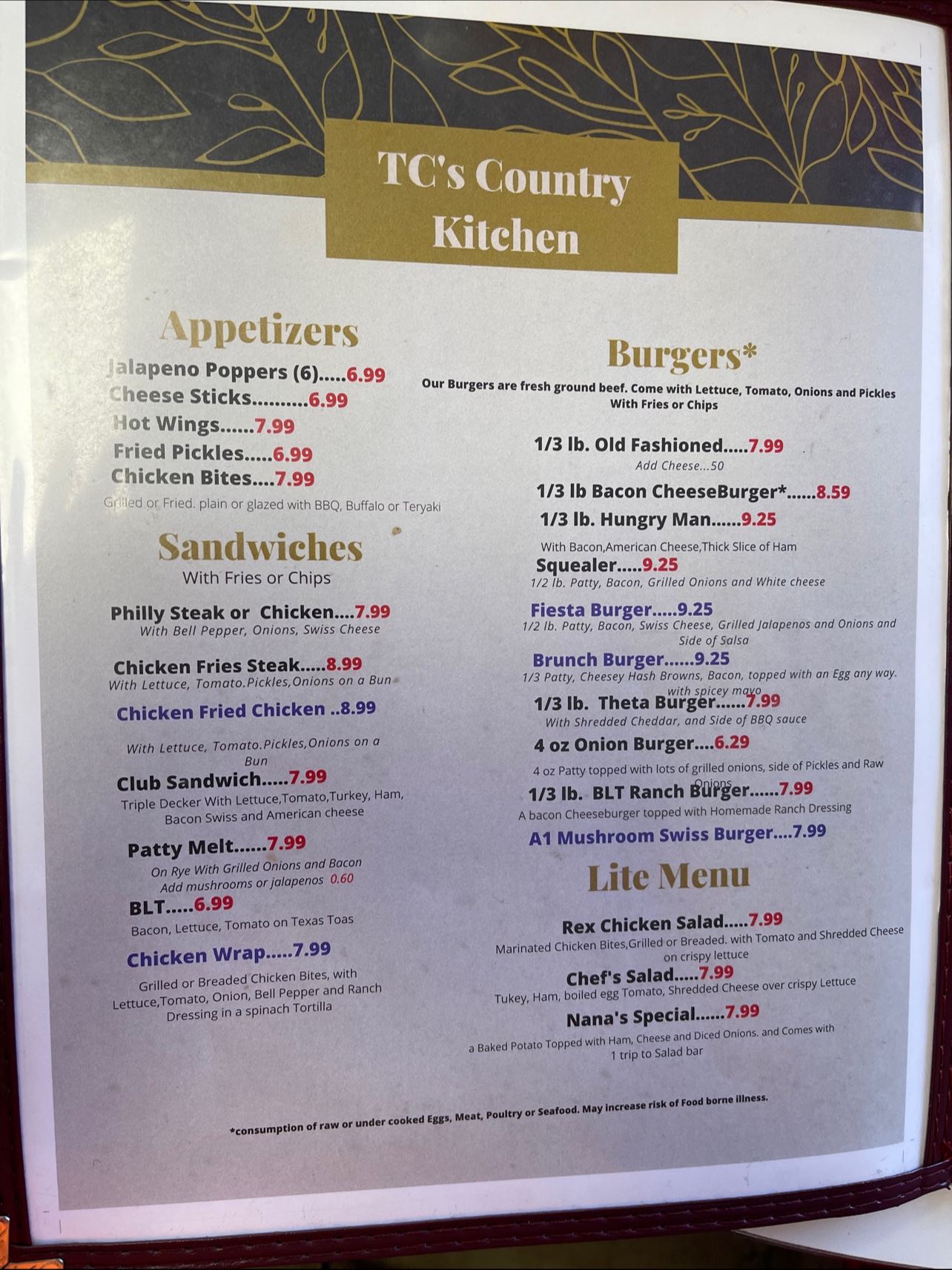 Read moreTc's kitchen used to be a good place to eat bit ever since the new owner took over a couple of years ago this place has went down hill. They never have the food I want that is on their menu and now to top it all off they are now charging $1 extra on everything on the menu because of rising food cost but yet nowhere else seems to be doing this. I mean I understand rising food cost and all but if you can't have the stuff on your menu in stock then take it off of the menu and if you don't have the stuff on your menu in stock then don't charge the extra dollar on everything it's that simple then not to mention the food quality has also went down hill since the new owner took over so all in all after going there many times since the new owner took over I do not recommend and the only reason I am giving it one star is because the staff aka waitresses are always nice friendly and helpful because they have to literally go through the menu to let you know what they actually...