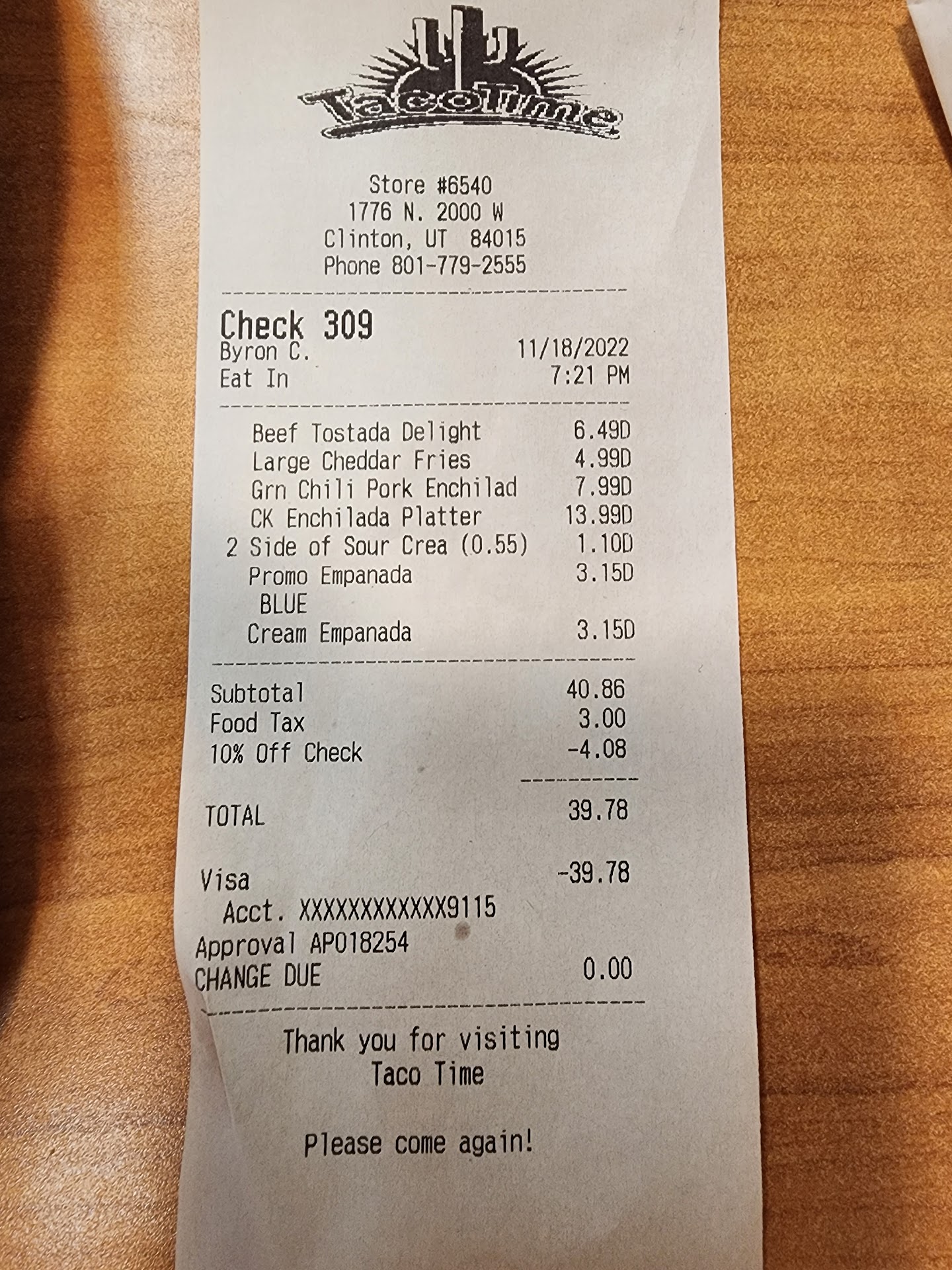 Read moreWent there around 9:00 tonight. And sat in the drive threw with no one answering for probably 10 minutes. Some of the employees standing at the back door looked at me and hurried back inside and then just continued to ignore me. There were 3 cars behind in the drive threw.I finally just pulled up to the window where there were multiple employees that saw me and still continued to just ignored me I finally just drove off as it was clear they where not going to take my order. The 3 other cars behind me were ignored as well. I understand if it was like 15 minutes to close or maybe even 20 not wanting to take an order but a whole hour if you didn’t want to work ok but don’t just ignore someone when you have clearly seen me. As soon as everyone cleared the drive thru they hurried and shut the lights off. If you don’t want to provide service after 9:00 then update your hours to a closing time of 9:00 so people don’t drive clear out there for nothing. Taco time is not...