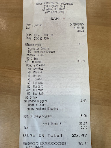 Read moreIf I could give this place a 0 I would. Let's start with customer service. So I went through the drive thru today, the manager was taking my order. She was so rude and nasty to the fact I didn't even eat my food after I left from getting my food at the next window . My kids wanted Wendy's so I ended up just staying and went on to order. They rude and have a nasty attitude even the employees. Keep in mind I went at 10:40 ,when they start saleing lunch. My food was so cold as if they cooked it at 9:00 clock while they was serving breakfast . The fries was stiff cold, and dry. The drinks tasted like water,as if they are to lazy or busy to change out the drink machine. I hope who ever own this place get there workers together ,ESPECIALLY THE MANAGERS. I WISH I COULD HAVE GOTTEN HER NAME. I WOULD HAVE LEFT IT HERE. THIS WILL BE MY LAST TIME SPENDING 32.00 FOR SOME TRASH FOOD AND SOME EMPLOYEES COOKING IT AS IF THEY CAN CARELESS,WHAT THEY FEED US. FOR THIS WENDYS TO BE IN CLINTON, YOU WOULD THINK THE CUSTOMER SERVICE AND THE FOOD WILL BE GREAT. WHOEVER ON THIS WENDYS, YOU NEED TO FIRE THE WHOLE TEAM AND GET SOME...