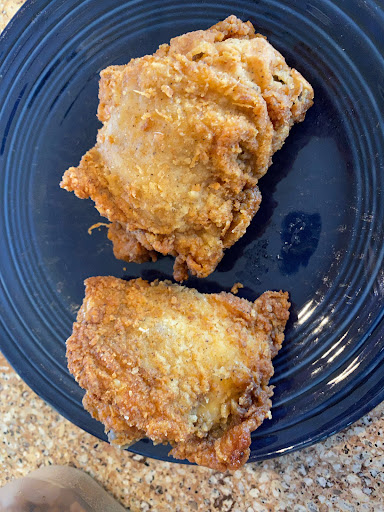 As I suspected, when I got home, I found that even though the Georgia Gold had not been applied to half of the chicken, the excess sauce had drained to the bottom of the platter, soaking all of the chicken pieces. I had to separate the pieces, placing the extra crispy ones on a paper towel in hopes that the sauce would drain enough to make them edible.
