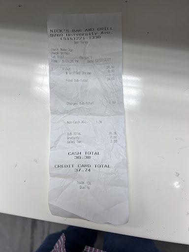 Read moreNick’s Bar & Grill used to be one of my absolute favorite places to go for dinner. Great service, steaks always cooked right etc.