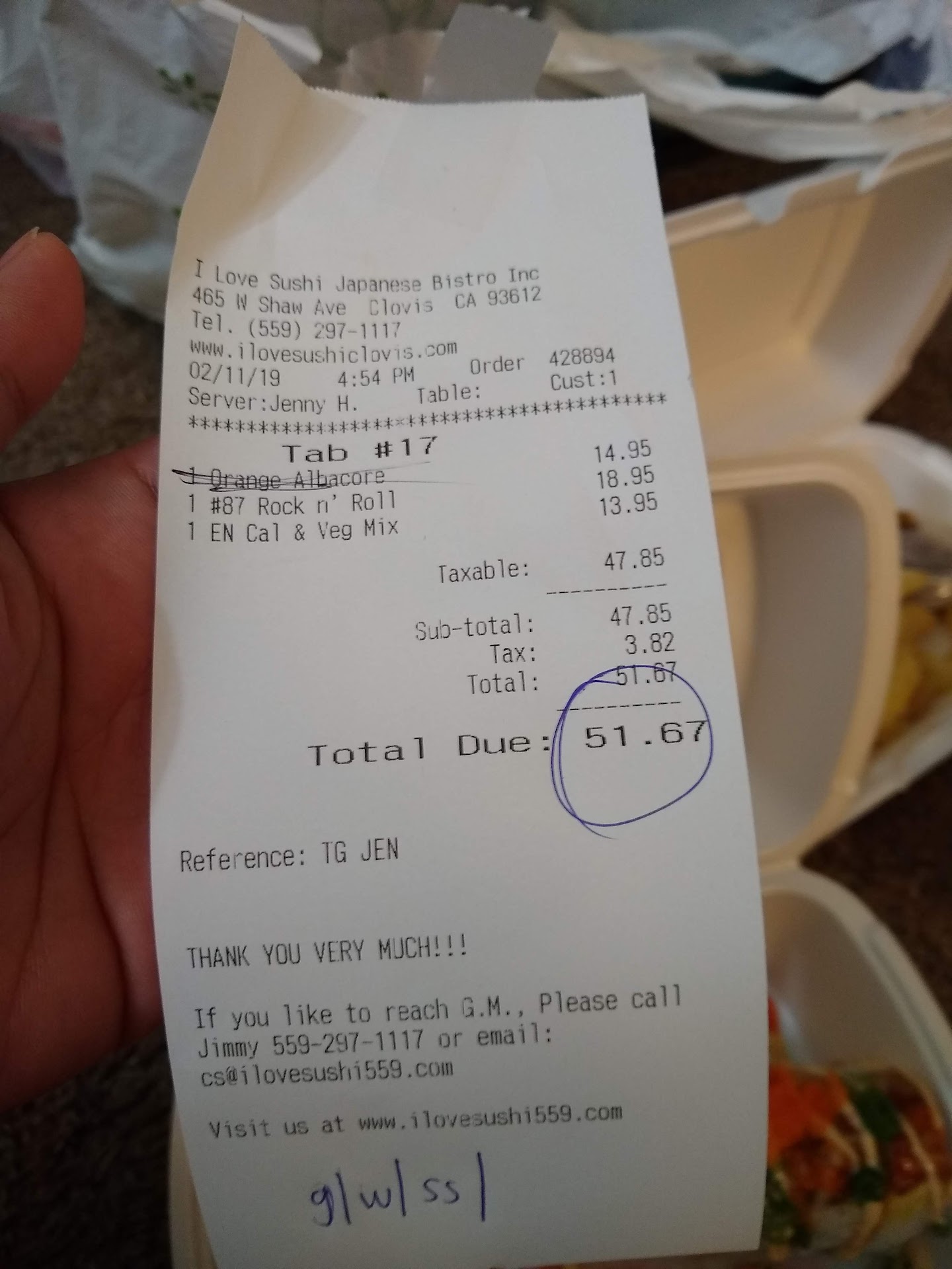 Okay so my husband and I spent $54 last Saturday there. The waitress was polite I guess but the menu was bland. There were pictures of sushi rolls but no caption below to tell you what they were. I ordered a $12 roll assuming that it would come with spicy mayo or sriracha. No where on the menu does it say which rolls come with what sauces. My husband complained about the same thing. The menu needs to be updated. So I ordered a $12 roll of sauceless sushi by accident. I ordered an $18 Godzilla roll and it came with sauces even though the sauce wasn't listed on the menu for that one either but it was way overpriced. Hardly any actual sushi and the pieces were way too large for my mouth because it was double wrapped in rice which is not a smart move bc rice expands in your stomach when you drink water so it doesn't leave much room to keep ordering food. Everything was shrimp and crab meat. Where was all the salmon ? What a sham. I probably wouldn't have even noticed that if the rolls weren't so plain. We usually spend $100 easily on sushi but not there. After the $10 tip we left, we only spent $64 and we didn't finish anything bc it just wasn't very good. Bland. I kept ordering spicy rolls thinking they'd be the ones that would come with spicy sauces but I was wrong. Even on the Godzilla roll it was skimpy w the sauce and for $18 you'd think they'd be zealous. The 911 roll my husband ordered was the only one that was sufficiently decorated but I couldn't enjoy it. Habanero is too much for me. He liked it but we like Kuni Sama and Yoshino's better bc at least you know what you're getting. My husband says the menu isn't descriptive enough and I agree. It makes it hard to order if you don't know which rolls come with what sauces. It was like sushi roulette. I'll bet it's frustrating for customers to have to deal with this same problem and having to ask the waitress about the menu is an unnecessary waste of time. Customers are probably taking it out on the staff that the menu is vague. I feel bad for the staff. I'll bet they have a hard time every shift. We won't be going back. Good luck. It's just not for us. Menu...
