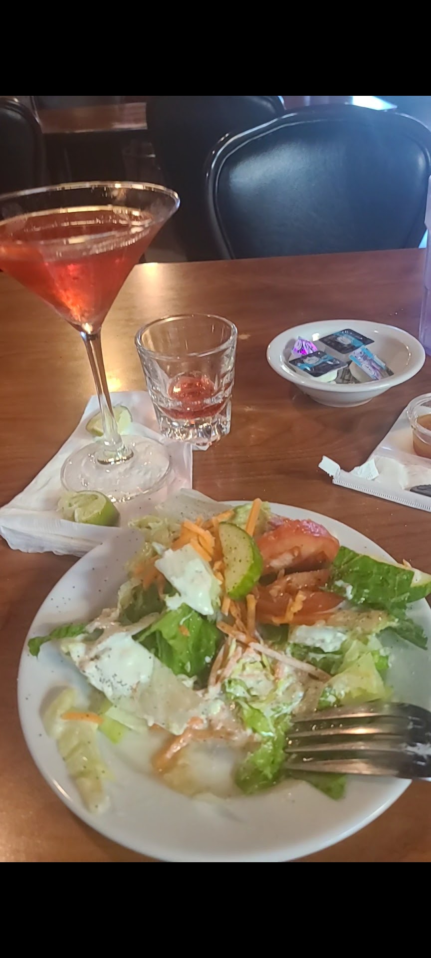 Came in here while waiting for car at garage and was pleasantly surprised initially at how clean this BAR is...had a cosmo and it was done well. Service was with a smile and helpful on recommendations. Side salad was very fresh and cold! (If only more places would do this!) Delicious with actual veggies not just lettuce with 2 carrot shavings. The roll it came with was hot and crispy outer, so good! I ordered the grilled salmon and although a tad bit on the salty side for my pallet, it was seasoned well and good sized. Veggies (zuchinni mix) was also seasoned and cooked well. Baked potato was great! I have mentioned before I am a home chef, so I'm usually not that impressed round here, hope to visit again soon with family. Total thumbs up! Even the bathrooms are updated and super clean! 👍🏻 (just had to...