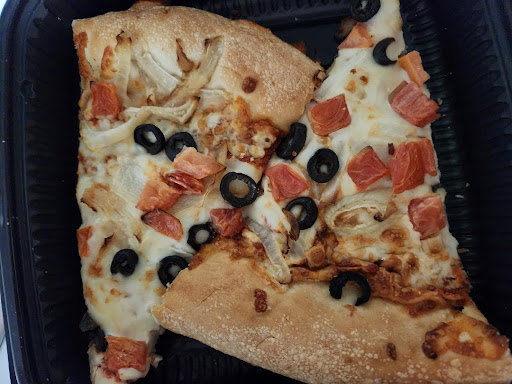 We ordered a large cheese with olives, onions and tomatoes. See pic. It looked ok, besides the toppings being the usual little dots for a lot of money. They should've just put the money on top. Between the cheese and "sauce" is some undefinable "gooiness". I even looked closely at it. It's not really the crust; it's some goo on the crust under the "sauce". And nothing makes this goo better.
