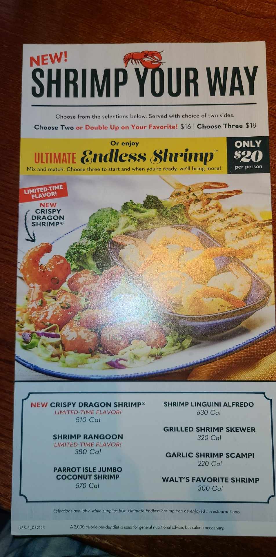 UPDATE 12/12/23 With the Ultimate Shrimp (now $25), you get 3 shrimp choices, but they did decrease the sides back to 1 choice. You may add a salad for $1.99, but they also have an option to add a salad or clam chowder and a Pepsi product for $5 more. With the grilled shrimp, the rice that comes with it is a smaller portion, and you no longer get the rice when ordering more. If you don't want the unlimited, you can order 2 shrimp choices for $17 or 3 shrimp choices for $20, both with 1...