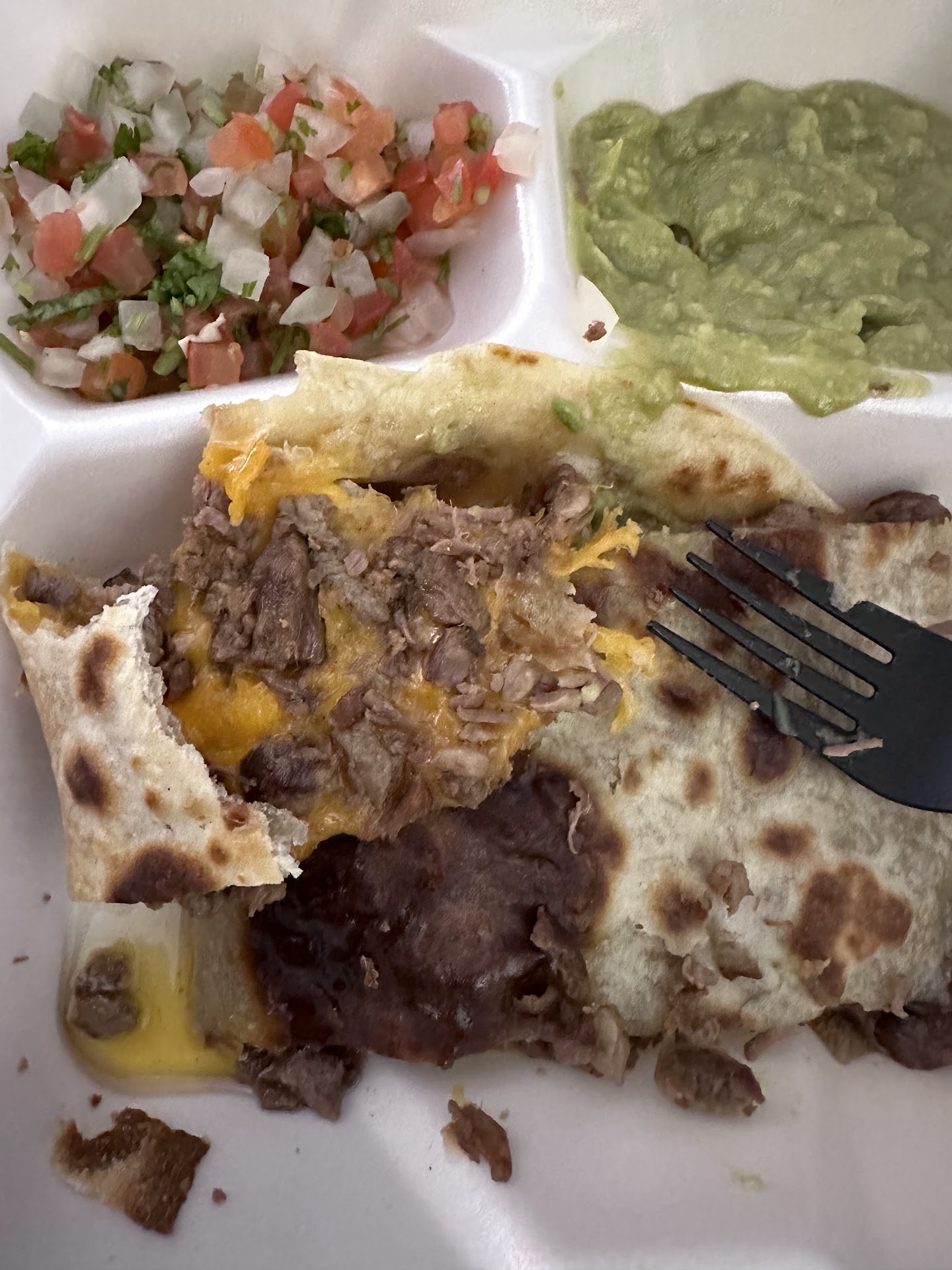 The beans were runny A rather stingy portion of shredded beef in three of the roll tacos and very little shredded beef in the fourth rolled taco .. the tortillas looked as if they were not just hours old but many hours old ... topped off with about a Tbsp & a half of guacamole.. for $9 ??