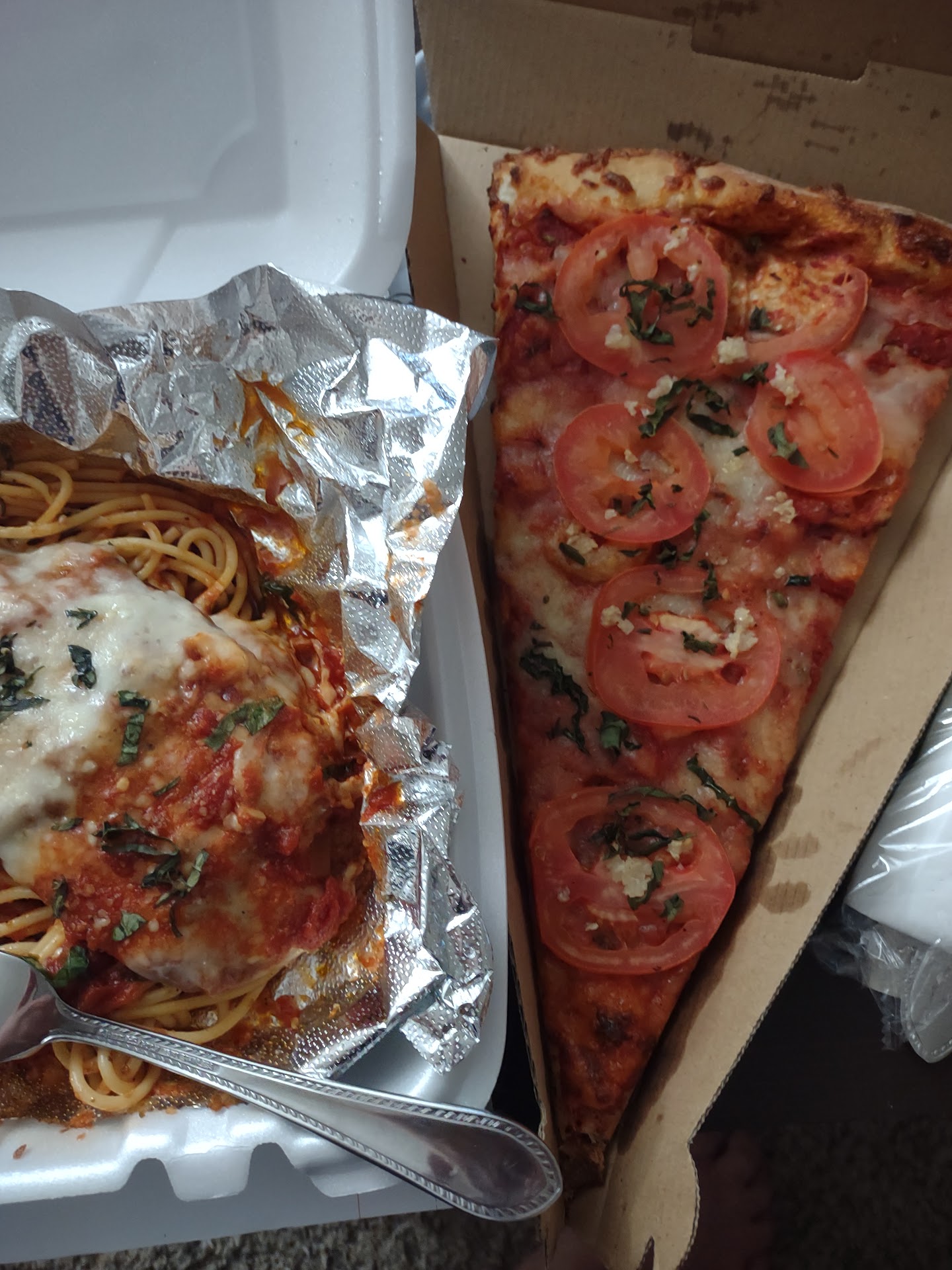 Read moreWe ordered a couple of slices of pizza and the chicken parmesan to go. I ordered my slice with Margherita toppings and my hubby ordered pepperoni. I thought that our pizza slices would be on the soggy side by the time we got home because we had to to take care of a couple things before we ate. We were pleasantly surprised to find out that the pizza was still nice and crisp...and absolutely delicious! Do you see how big that slice is?! I put my mouse and the place of chicken Parm next to it so you can see how big that slice really is. My husband and I both really like chicken parmesan and were more than surprised at how delicious this was. It is different from every chicken parmesan we've had anywhere. All the flavors that you want are there... it's just better!