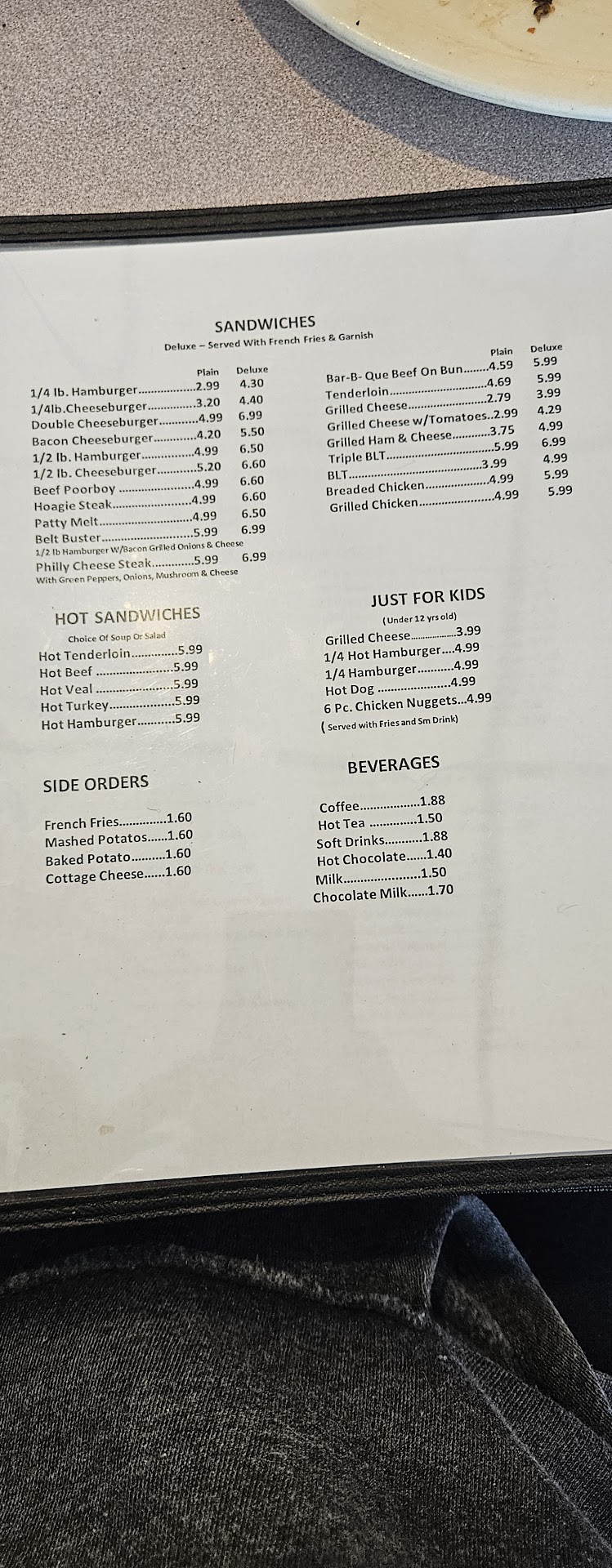 First impression was it is small but looked clean enough. I went worth my daughter and little grandson. We were going to get an high chair but it was absolutely filthy so I seen a booster chair but it was also very dirty so we just let the baby stand on the bench. We ordered a couple of cheese burgers and fries and some kids nuggets. The cheese burgers were below average. They looked frozen and were tasteless. The nuggets just looked like something you can grab at Walmart and microwave at home. Which isn't that big of deal. The entire meal came to 16.00 which is very reasonable but I couldn't really eat the food. Over all it was ok. I should of had breakfast. I'm sure that's...