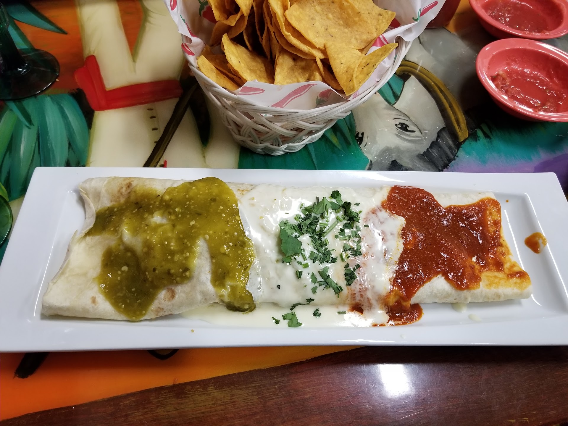 I've been craving Mexican food for months now and a friend recommended this place to me so I thought I'd give it a try. I placed a carry out order so I don't have much to say about service (except they said they could have 2 combos ready in 5-10 minutes... that's impressive!) The place itself looked very bright, colorful and clean. I liked the atmosphere... for the most part. I did NOT like that when I walked into the front door that I was basically standing at someone else's table. Talk about awkward. The layout in respect to that front door was very weird. I found it odd that the cash register is adjacent from the only entrance and exit to the bar. So if you're paying and someone wants to exit or enter the bar, you basically have to move. I order The Patron Combo. A burrito, enchilada, chile relleno and a taco. Everything was good, except the chile. The breading was very thick and it tasted like it was fried in 3 year old grease. I could not taste anything aside from that old oil flavor. Even the super tomatoey sauce on top was just killed by the taste of grease. The chips also tasted like they were fried in old grease. Maybe it would have been better fresh? Unfortunately, I don't foresee myself ordering it again.