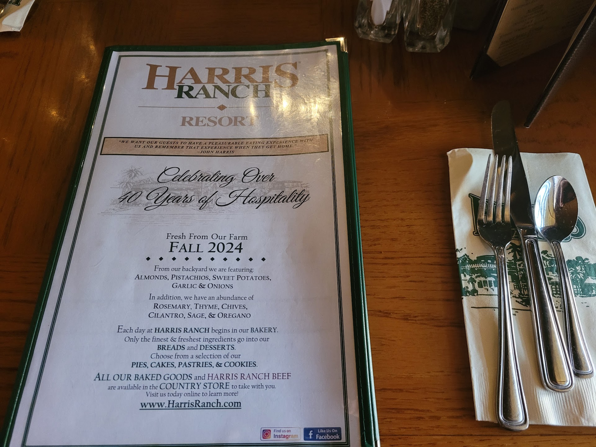 Read moreMy husband and I always wanted to stop at Harris Ranch Steakhouse since we travel the i5 all the time from Az. To Northern California. Well we finally did on our way back to Az. After attending a funeral we finally decided to do so 1/5/2024 evening around 830pm. I must say it's not anything to brag about, I've been to far better Steak houses....we were seated.. sat for over 10 minutes while we watched many people pass by without acknowledging that we were present ( not even a glass of water, or I will be right with you) finally I grabbed a server as she was walking by and asked may I have a glass of water please. The hostess Monsai was great very helpful, Sarina was our server she was excellent. She came to the rescue! However, we were not impressed at all...we had the 24oz porterhouse and split it since it was so late for dinner ... And ordered 2 side potatoes and 1 side veggies... The steak was Soo grissley and tough... One of the toughest steaks my husband's ever eaten for any kind of money. We just didn't have the heart to say anything else about it. The manager was already kind and had come over and apologized. The server was excellent, And we did not have time to wait around for them to get us another steak so we let it go we had over an 8-hour drive still to go. They had already apologized for the service and lack of attention....and gave 10 percent off and a free dessert , so my husband and I chose not to say anything but I doubt that we will ever stop again which I'm very sad to say. And we probably would never recommend it also. We will never bad mouth the restaurant by any means but if anybody asks us we would have to tell the truth. I myself was a server for 31 years and a manager of a restaurant so I do understand all that's involved of running a restaurant. I will say the manager was nice The gal that I stopped Serena she was great she ended up being our server and she tried to accommodate in every way possible. We just did not have the heart say anything about the steak so we chose to take it home. Thank you so much though for trying to accommodate us, we are sad that it wasn't exactly...