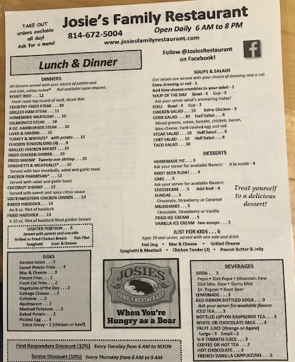 Josie’s is a home town, family restaurant in Coalport, PA! Home of delicious wings, lobster wraps, salads, pasta, dinners, and a huge breakfast challenge! I can’t recommend this place high enough. We usually come in two-three times a week, and are always greeted with excellent service, a big smile, and we feel like family....not customers.