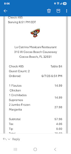 Read moreLa Catrina is a gem of a Mexican restaurant that truly delivers on both flavor and hospitality. From the moment we walked in, the warm, festive décor set the perfect mood for a memorable meal. Our server greeted us with a genuine smile and guided us through the menu with enthusiasm and expertise—setting the tone for an outstanding dining experience.