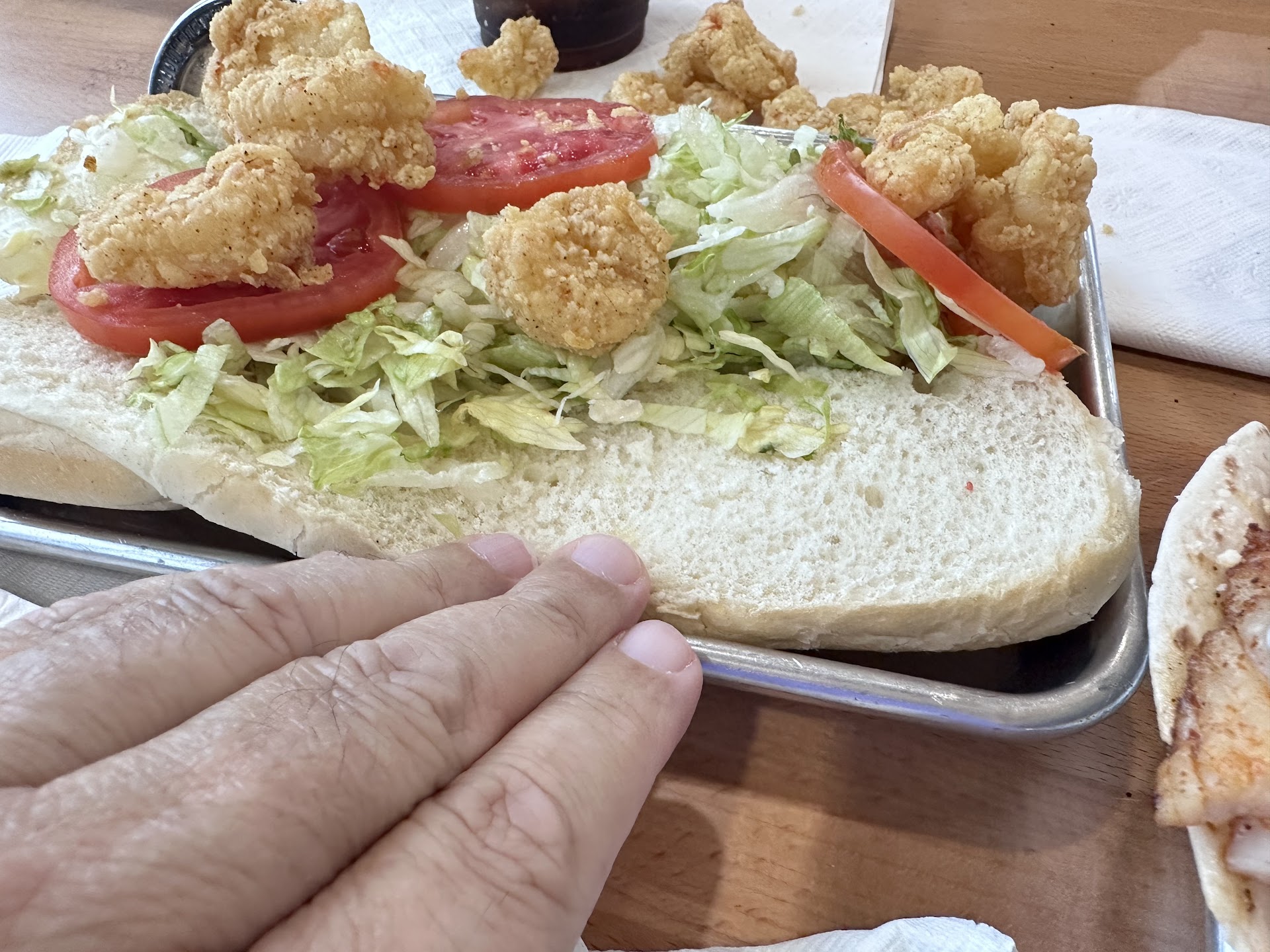 The Shrimp Po' Boy, a traditional Southern sandwich was not at all tasty. I've said it a million times and I will say it a million more, âAny sandwich begins with the bread.â A delicious base is a must for a truly delectable sandwich. This bread was a few days past it's freshness date and had the dry taste of a cardboard box. No wait, that's an insult to cardboard boxes everywhere. The shrimp was incredibly unpleasant. The texture was mushy and the taste fell flat on the palate. Don't even get me started on the flavorless liquid that passes for a Remoulade sauce around here.