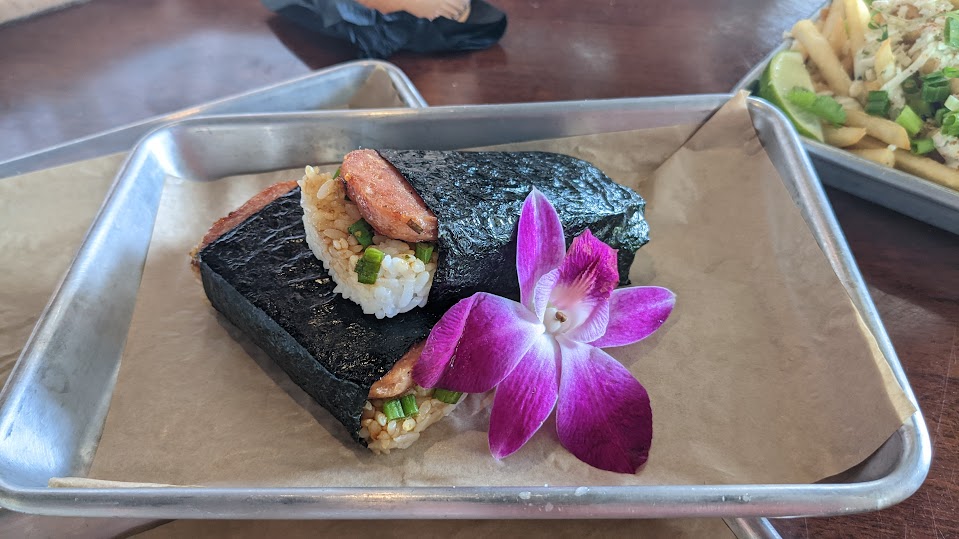 And the Musubi (2 pieces, griddled Spam, pineapple teriyaki, furikake, green onion & sushi rice, wrapped in nori). If you know what musubi is, you know. If you don't, it's one of the best snacks on the planet. This is a very big musubi, very sharable, and a nice hunk of Spam for you to fill up on.