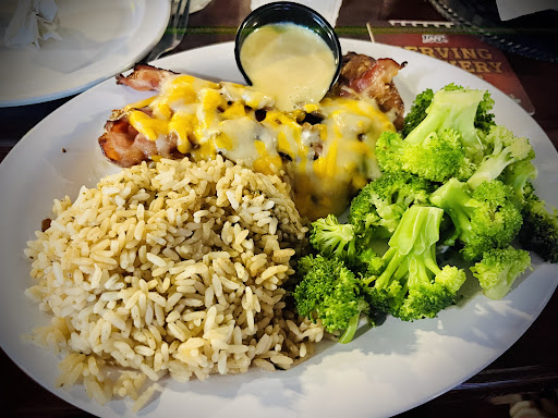 The Cheesy Bacon Chicken is my go-to, no matter how many times I try to convince myself that I'll order something different. It's just the right amount of food for me: Two small chicken breasts (tastes wood-smoked) topped with sautéed mushrooms, two slices of smoked bacon, and creamy cheddar jack. The honey mustard on the side makes a great dipping sauce or topping. It also comes with seasoned rice and steamed broccoli. The flavors complement each other, so I enjoy mixing up the rice, vegetable, and meat to get a slightly different experience with each bite. At 960 calories minimum, it's not hard on my diet, either.