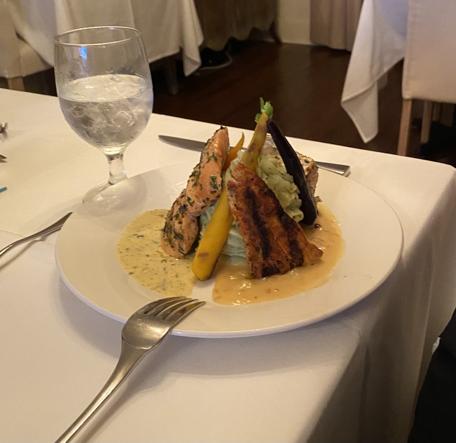 The table was perfect, in the corner with a window view. Everything was charming and quaint. The contrasting wall colors paired perfectly with the stylistic chandeliers. Then Monica greeted us first, professional and polite. Next was Tara, who took care of us for most of the dinner.