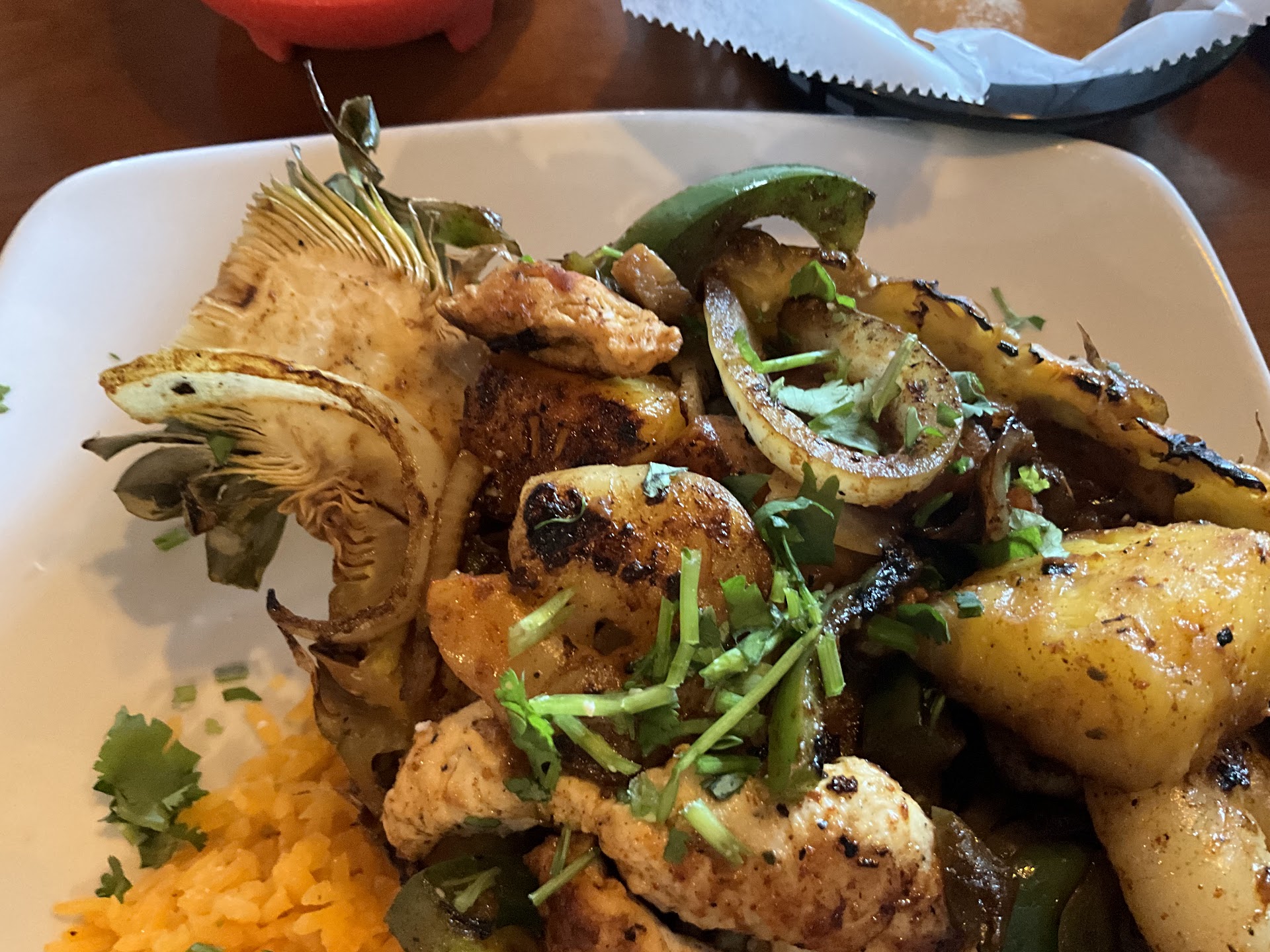 For the main course, I got the PiĂąa Veracruz (pictured). Take a pineapple, split it in half and hollow it out into a serving bowl. Fill with Grilled vegetables, shrimp, chicken, and chunks of pineapple, served with rice and tortillas. Perfection. Big juicy shrimp, all the ingredients grilled like individual kebabs, and very generous portions. I would recommend this dish without hesitation. And wonder what became of the other half of the pineapple. You know, in case they had some pineapple sherbet in the back and were trying to figure out what to serve it in. Itâs just good to be prepared for scenarios like that. Unexpected dessert situations.
