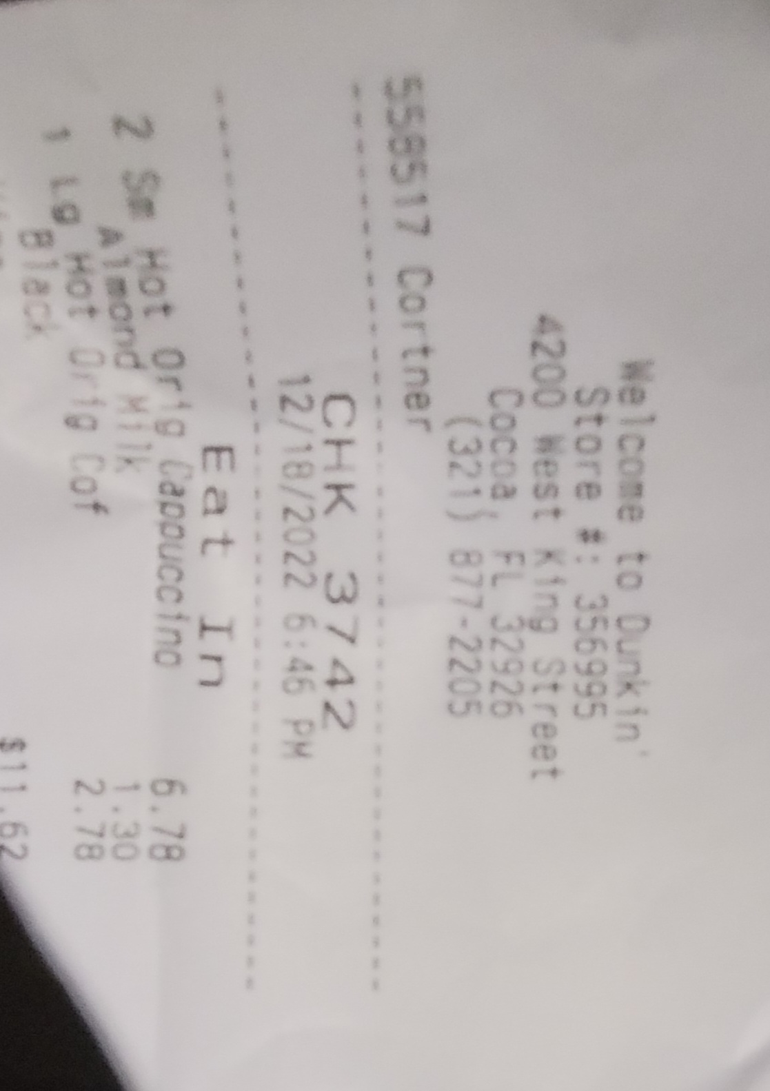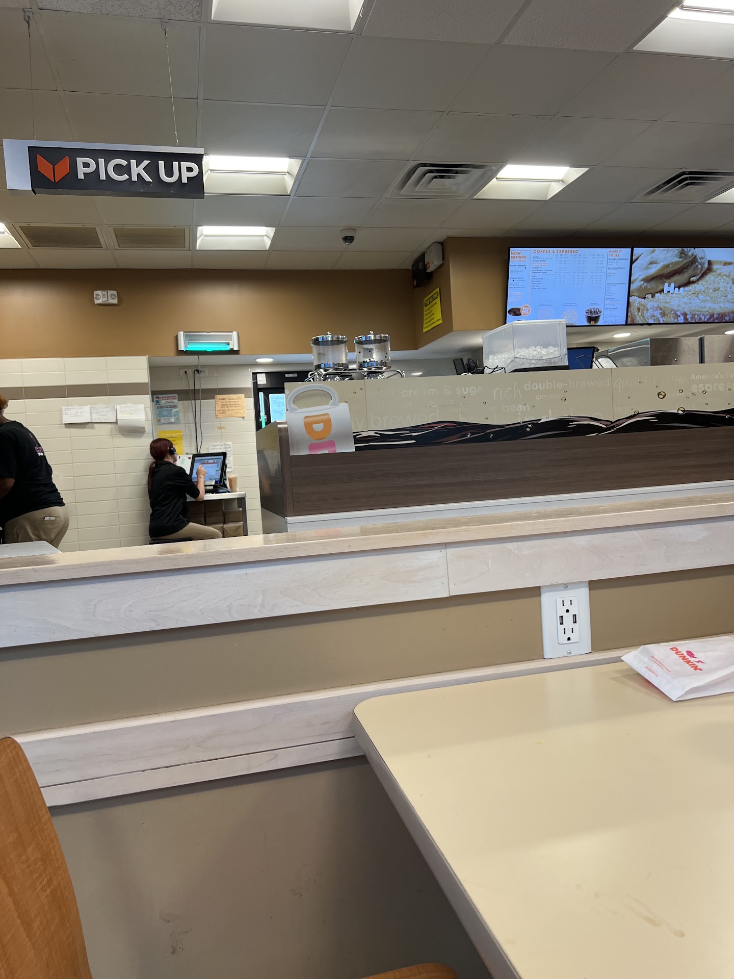 Read moreGood place to stop for a coffee and donut This is located on the east side of the I-95 interstate and on the north side of Florida State Road 520. It is a stand-alone building with the iconic Dunkin Donuts’ look. It is located between an Ihop and a gas station. You can either arrive at this location by 1)turning as though you are going to Sam’s club and turning through the gas-station parking lot or 2) travelling past the building on 520 and making a u-turn into their parking lot. Parking is limited as there are only about 11 parking spaces. You can either use their drive through or eat in at the restaurant. There were about 6-8 tables to seat between 2 and 4 people each The restaurant was small but the staff was wonderfully friendly. We ordered coffee, pumpkin and apple donuts. The prices were reasonable and the inside was clean. The outside trashcan was overflowing but overall the area was clean. The coffee and the pumpkin donut were good. The apple donut was not as good. We think it would have been better warmed up but that is for another day. Overall, it was a very nice visit made more so by the staff’s...