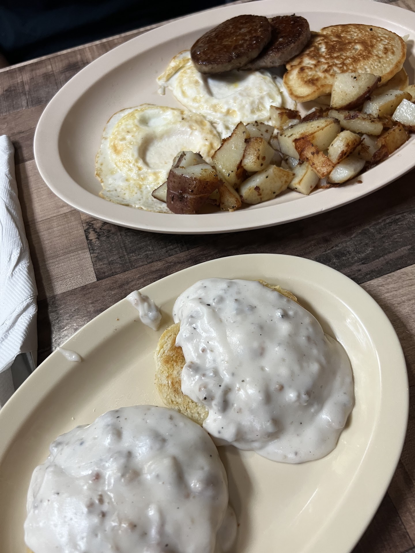 Read moreSo I couldnt sleep and it was my day off today. I knew I would be cooped up in the house all evening with tropical storm winds so I searched what place does breakfast (that has good reviews) that i havent been to before. I ordered the deluxe breakfast which hit the spot! 2 eggs, 2 pancakes, hashbrowns, sausage gravy & biscuits, and of course bacon! The eggs were cooked the way I liked, the bacon was extra crispy (as I requested), and my coffee cup NEVER came close to being empty! Which brings me to the next side of the story....This service; The waitress knows the customers names and with little help ran the complete dining room (With no empty tables) by herself. This place was ran like a well oiled machine. I will...