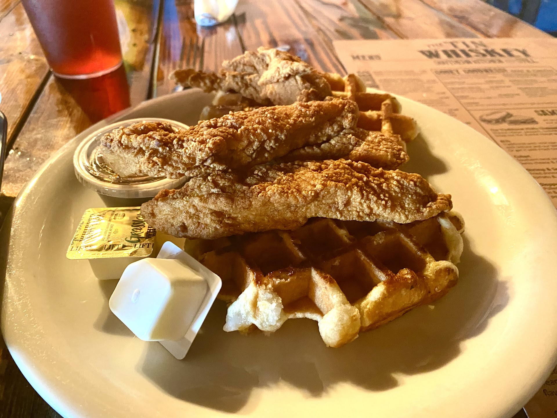 Tin Whiskey has a diverse menu of flatbreads, sandwiches, and full-blown meals. I ordered my go-to Chicken & Waffles described on the menu as two waffles with caramelized pearl sugar and topped with four large hand breaded chicken digits. Hand breaded? When I pressed her, Kyla confessed that they were not breaded by hand by a human being in the back, but indeed frozen chicken tenders. At least they were not low quality. The waffles were the prepackaged Le Waf waffles sold by the Little Debbie company. One pop in the microwave and voilà, chicken and waffles. Not sure unwrapping waffles from cellophane is gourmet, but hey, it worked.