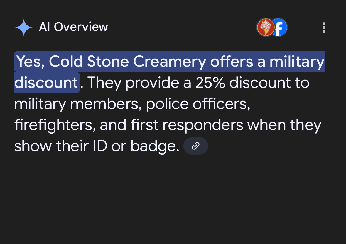 Read moreAfter a lunch in the same plaza, we decided to pop into Cold Stone for some ice cream to go. There was small line when we arrived, and there was a customer at the register who was apparently having some sort of issue, and it took two (of three) employees to get it resolved. That customer left and said he'd be back in a little bit. Meanwhile, a line had formed, and a third employee came out of the back with a drink and went out the front door on break.