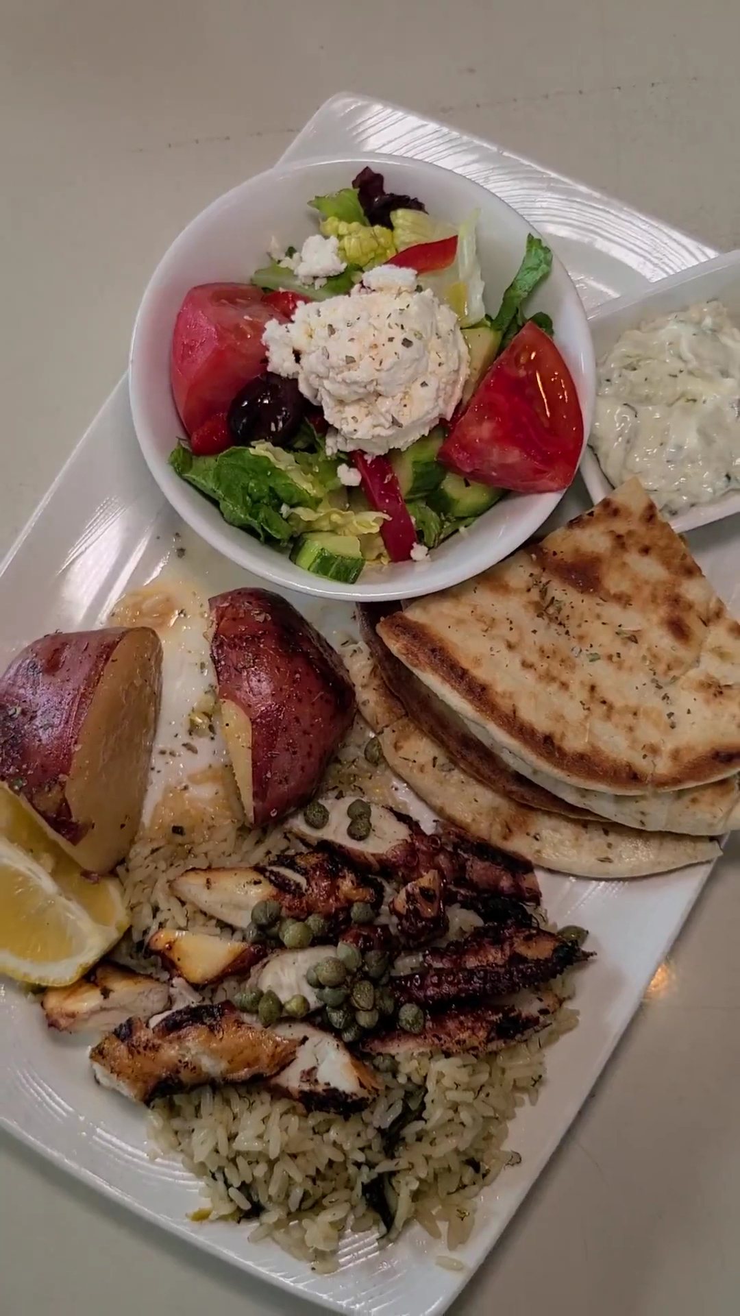 For our meal we decided on the Silver Taste of Ethos which requires a minimum of two people ($32 per person). It is a great way to get a bit of everything and really sample the menu. We started with the spread sampler which includes four dips: a tangy tzatziki, hummus, zesty creamy feta, and sriracha tzatziki. The dips were served with the most heavenly hot pita. Along with the dips were two of the tasty dolmades, traditional stuffed grape leaves which the staff hand rolls over 60,000 a year. Next up was a fresh and crisp Greek salad studded with creamy, salty feta. The star of the meal was the grilled meat platter that included spinach rice, potatoes, gyro, grilled chicken, and kefte. It was so much food, more than we could finish and we each left with a takeout box. Desserts are made in house but we were too full.