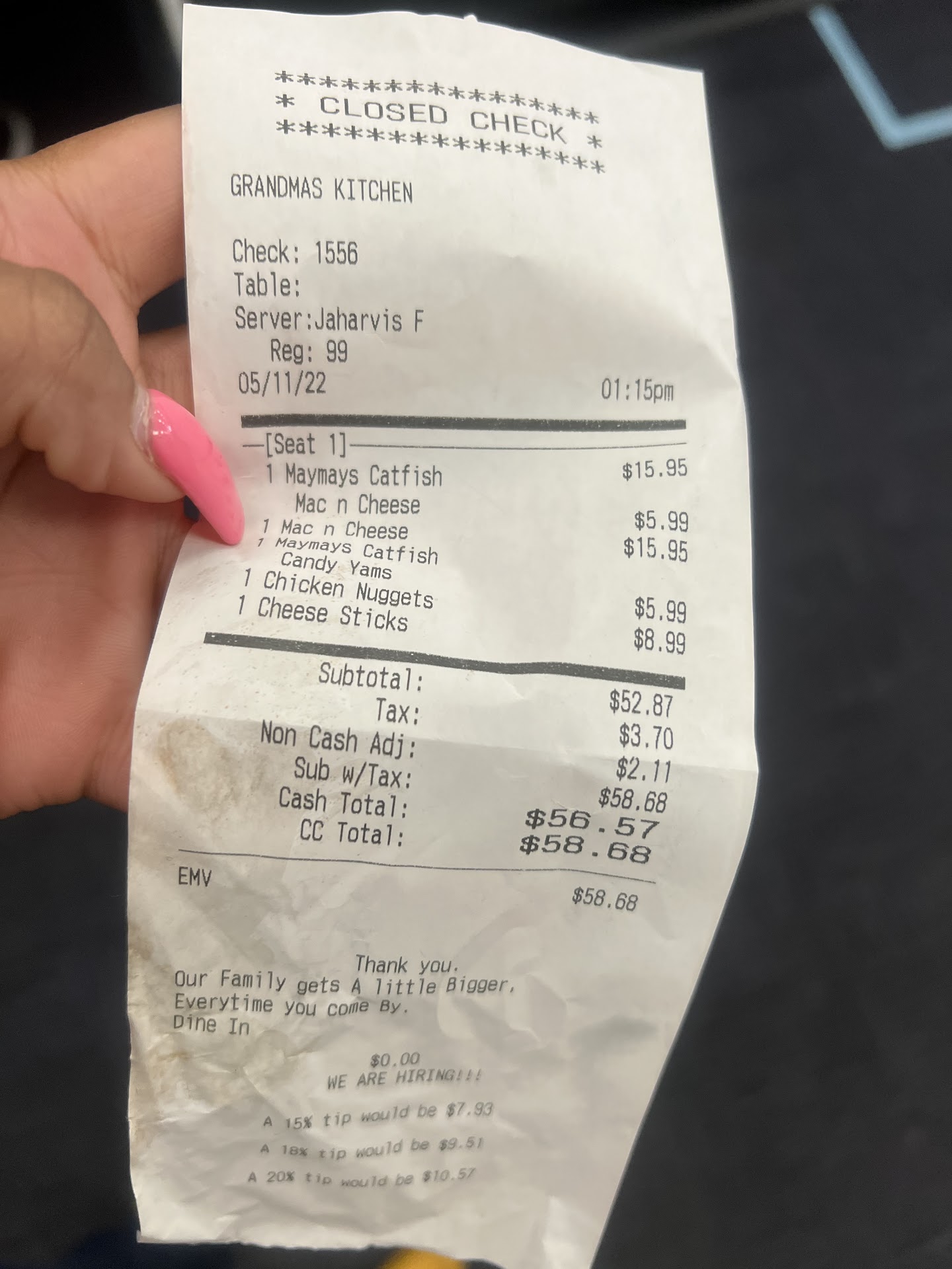 Read moreI wanted sooooo bad to like this restaurant and I had really high hopes for it! I was excited to see a southern restaurant and what they had to offer! Then thinking that I would no longer have to travel to Sundayâs Eatery for Southern Food (unless I am cooking it myself). My coworkers and I first got it and we were thinking it was okay! All of us agreed but at that time, I would have rated it a 3.5. I got the catfish, macaroni & yams! Okay! I didnât feel like cooking on a Sunday and opted to go here for my family- almost $60 later- my husband and I deemed it the WORST MEAL of the Year from a restaurant. He got the catfish (sway) with yellow rice and greens! He said the only decent thing was the greens! He spit out the yellow rice and played with the fish. I got pork hops (fried in old grease), macaroni and yams (I can confirm they are canned because the lady after me that ordered asked). My kids had wings and fries! I bit off the chops and knew immediately I wouldnât like it but I proceeded and tried to force it down! I threw out 90% of the food! The young lady that assisted me is the reason for the 2 stars! She was pleasant. Would I eat here again- SOLID NO đ and I really wanted to support!