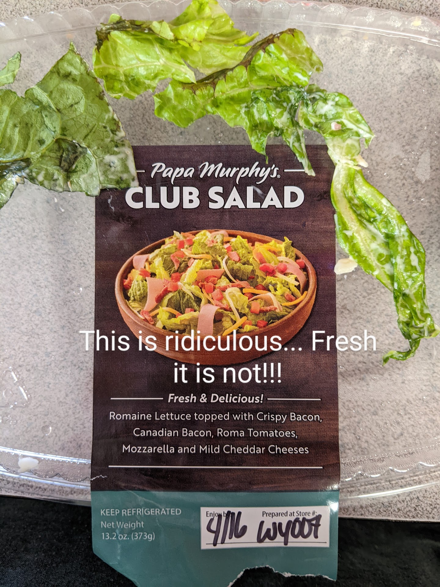 I usually have a very good experience when I come to Papa Murphy's but this time I am extremely disappointed. Spent $12 on 2 fresh premade salads and found rotten wilted lettuce in my fresh salad... You guys need to take a little care and pride in your products... This is...