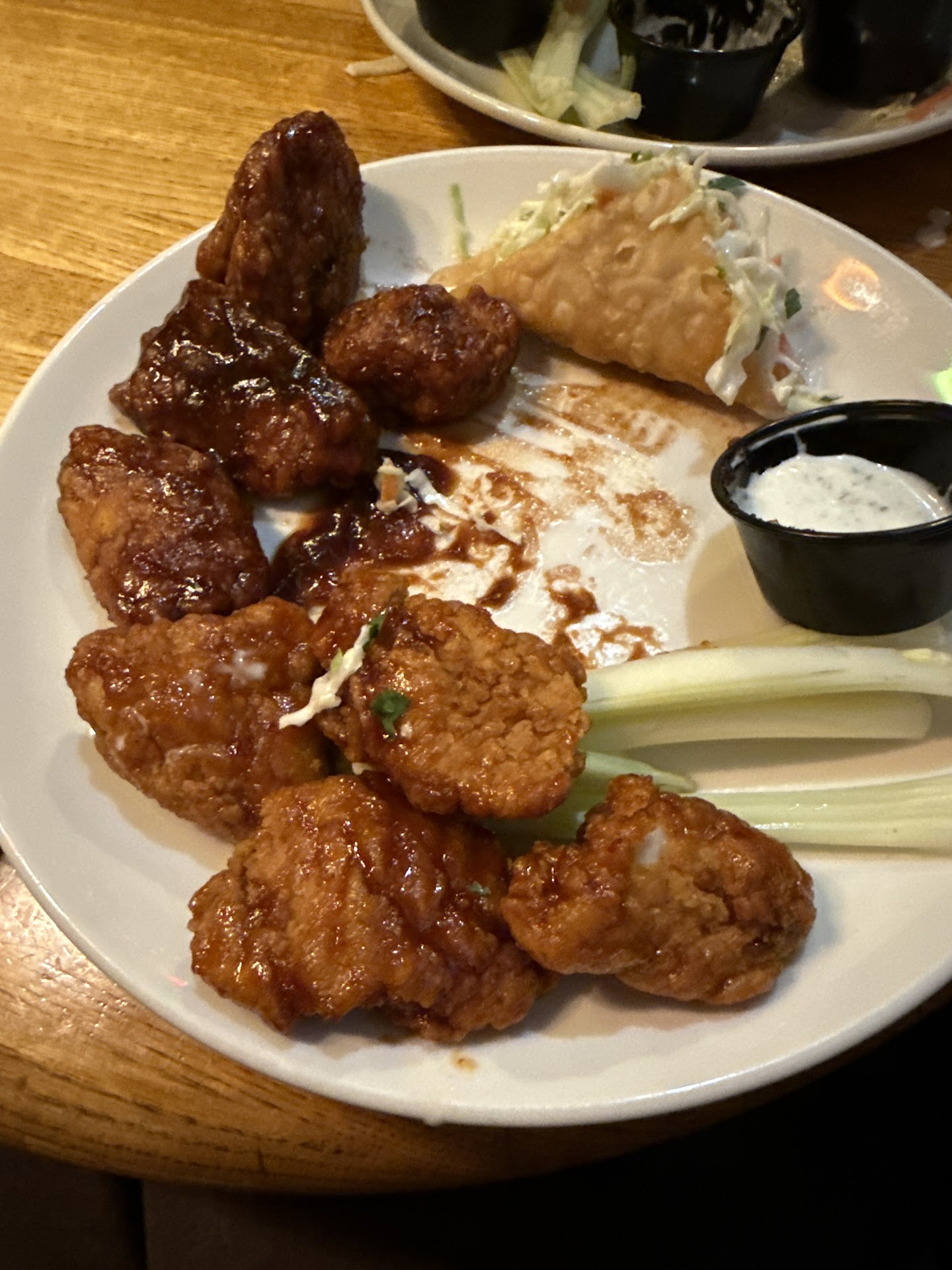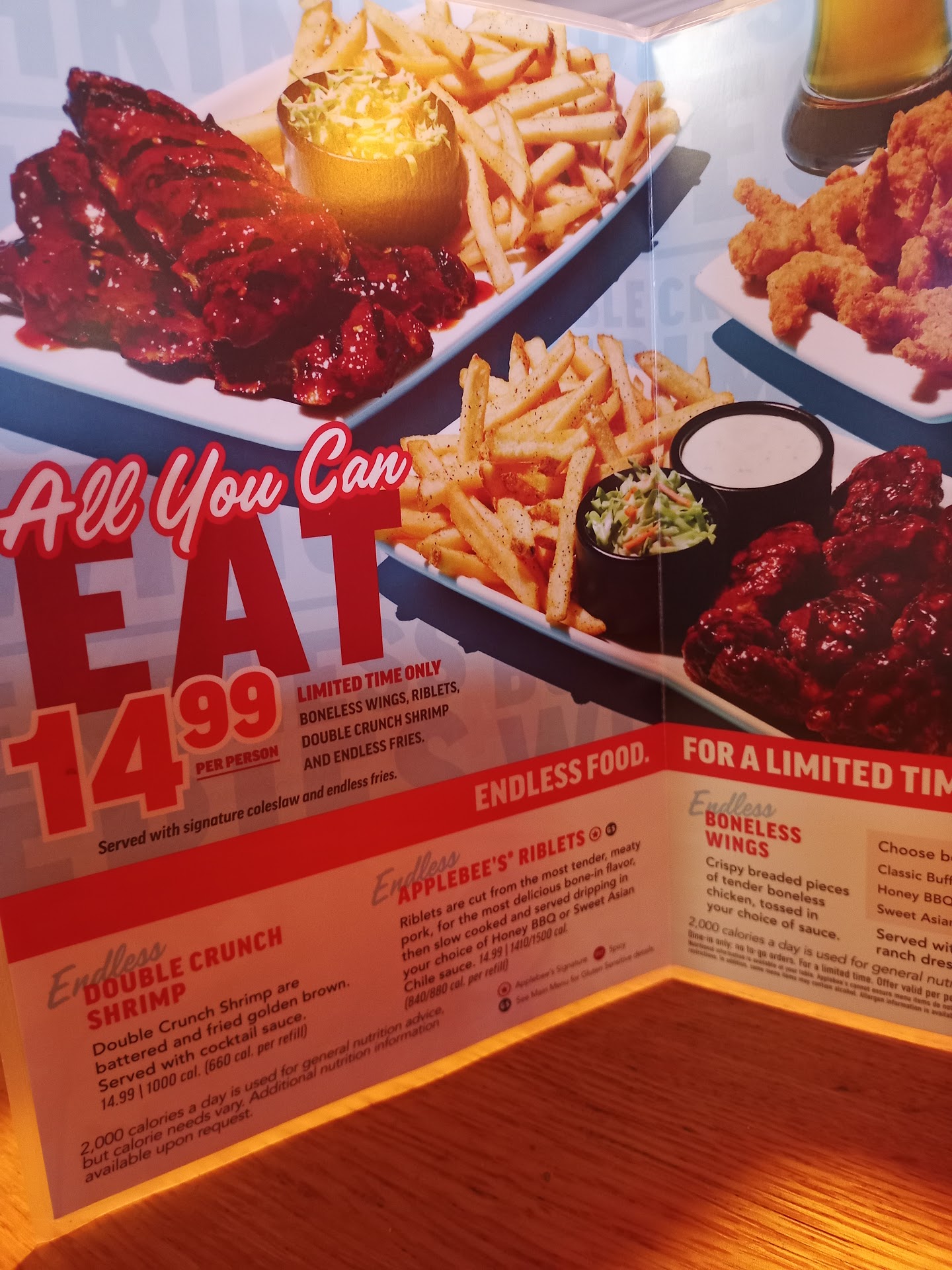 Read moreWe had a great experience at Applebee's on Hanley in CDA! We had a friendly greeting as soon as we walked through the door and we were seated right away. Our server, Leah, was very friendly, she got our order right away and brought us our drinks. We didn't have to ask or wait for a refill, that's something that I really appreciate personally. We got the all you can eat riblets, breaded shrimp, boneless wings and fries, which came with coleslaw. The riblets have 2 sauce options a honey BBQ and a sweet asian chilie sauce, I got the honey BBQ but I think next time I will actually get the sweet asian chilie. The boneless wings have 6 sauce options, classic buffalo, garlic parmesan, honey BBQ, sweet asian chilie, honey pepper and extra hot buffalo. Unfortunately I didn't look at the menu so didn't realize there were so many sauce options and I got classic buffalo, effigy was more salty than flavorful and I could only eat a couple before ditching them. I also got the breaded shrimp, which I forgot to take a picture of because it was so good I ate it, probably, way too fast and in my opinion, the shrimp stole the show! The fries were typical, nothing special about them and actually were not very hot or fresh, which was a disappointment because I'm a potato person! The coleslaw I couldn't eat, it had cilantro in it and in my personal opinion feel like there's no place for cilantro in coleslaw, and honestly, I would've liked a good coleslaw with my meal, with the riblets especially! The soda was good, I got a Pepsi and it was well carbonated! For the price it was definitely worth it, I want to go back and try the different sauces, and get more of that shrimp for sure! The ambience was nice, I loved the amber lighting and the booths were very comfortable! If the fries were hotter and if the cilantro wasn't an element in the coleslaw, I would give the food 5 stars, and overall the experience 5 stars, even if the fries were hot and fresh it would get a 5 start review from me, but because of those 2 things I will say overall it was a 4 star...
