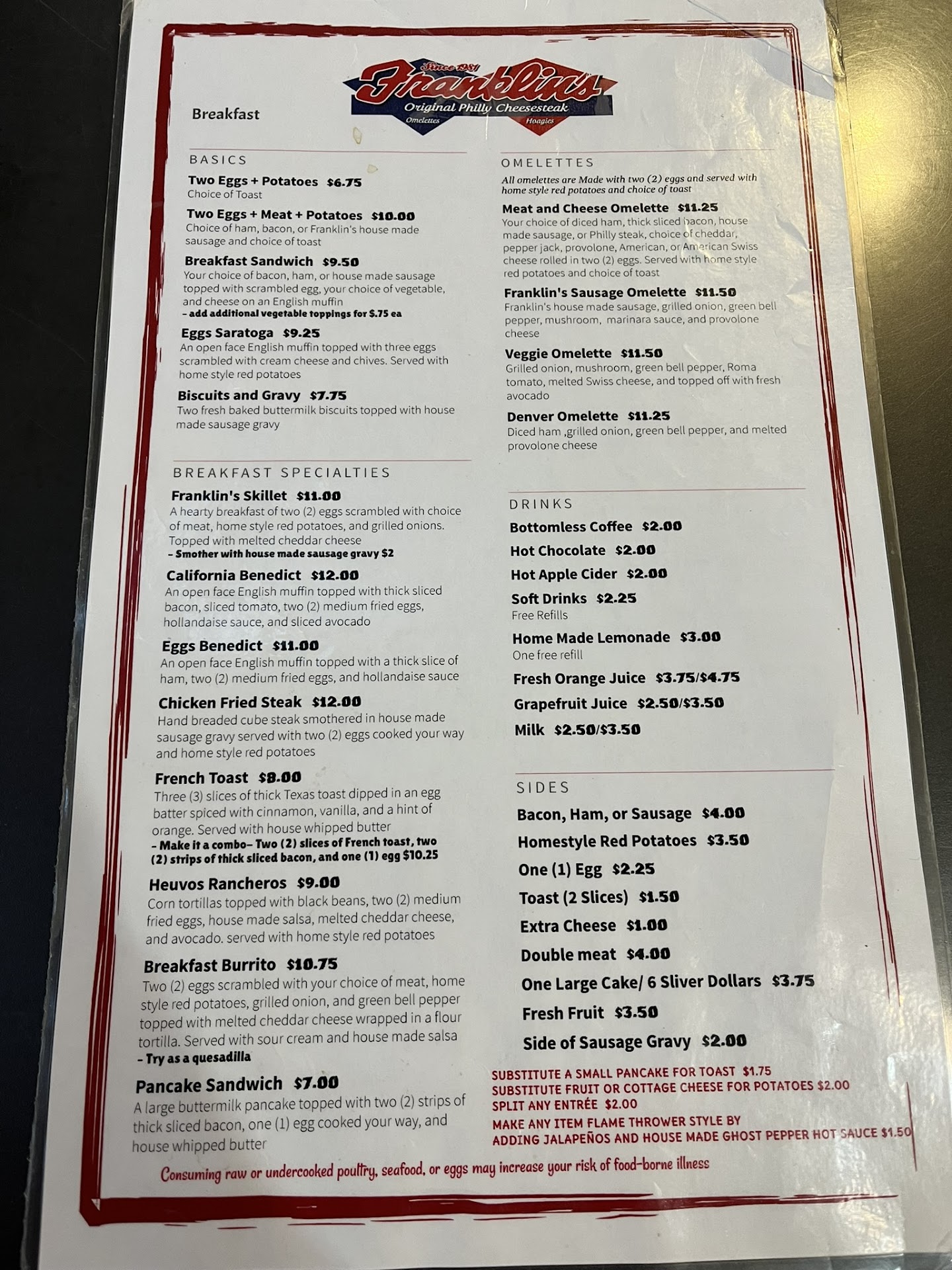 The food at Franklin's is a symphony of flavors, expertly crafted by talented chefs who clearly have a passion for their craft. Whether you're craving fluffy pancakes drizzled with maple syrup, perfectly poached eggs benedict, or a hearty breakfast burrito bursting with fresh ingredients, Franklin's has something to satisfy every palate.