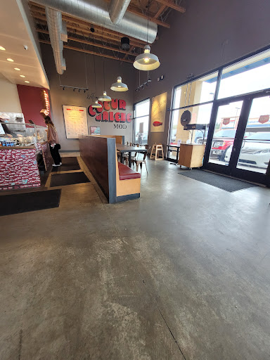 Mod Pizza, is the original "Build your pizza" place. It originated in Seattle in 2008. People call this the "Subway of Pizza". You can choose a "classic" pizza or salad off the menu board, and +/- any toppings. Or, you can Build it yourself, from the crust to the plate. THE PRICE DOESNT CHANGE. So you can have the simple favorites you like, or create a monstrosity only you could love. What you're REALLY paying for, is the size/type of crust/salad, NOT what goes on top. Warning: you're gonna think piling on 10 toppings sounds like a good idea, but just because you CAN, doesn't mean you SHOULD. The more you pile on, it becomes harder to cook the middle properly, which means it will be cooked unevenly, and can cause the outer edge to be more done than the rest. However, if you insist upon having 10+ toppings, ask them to "roll/dock/dimple" it when you start, itll help it cook and if they know its going to be a lot of toppings, they can moderate it properly, so u get what you want, and it's not 4 layers high. There's a few choices for crusts. The original crust : Vegan. an 11 inch thin crust, commonly pressed out fresh minutes before you get it. Its simultaneously crispy and chewy. And you can ask for it to be crispy/well done/light bake, per preference. It's about $8.45 at this Mod. A MINI : Vegan. same as original, but about 6inches. Making mountains on this size isn't a smart idea. If it's too high, you'll lose a couple toppings off the top/edge when it's in the oven. A Mega : vegan. Their answer to thick crust. Seriously tasty. It's 2 11 inch crusts pressed together. Gluten FRIENDLY : Vegan. 11 inch crust, is chewy and is quite popular. $2 more than the Mod. All of the toppings are Gluten Free. They say "friendly" because it all goes into the same oven, with the same paddle. But I've seen them go out of thier way for those with delicate allergies (wash hands/glove change/fresh cutters/use unopened toppings from under thier line) Never be afraid to ask for a glove change. Cauliflower Crust : 11 inch. NOT Vegan. (Contains cheese) Gluten Friendly. Thinner than the GF, is chewy and Tastes like TOASTED PARMESAN CHEESE. Popular, and worth the $2 difference. You can also get "garlic or cinnamon" strips, with several different sauces/dips. But the best is the "cheesy garlic bread". It's made with the MEGA crust, with olive oil, parm, mozzarella and rosemary. Around $6. Worth it. There are also 3 sizes for salads, and a "pizza salad" which is your salad mix on a mod/GF/CF crust, which is baked with asiago. It's whatever you want in a salad, as long as it fits in the bowl. There are even 4 choices for your greens. The choices of toppings can be overwhelming. 6 cheeses. 6 base sauces. Sometimes as many as 20+ veggie choices. (Several roasted fresh choices every day) 8 meats. 7+ dressings. 7+ finishing sauces. A variety of bottles drinks, as well as 4 tap beers, 2 house made teas, and 2 house made lemonades. And milkshakes, and BOTTOMLESS float refills while you're there. The No-name cakes are tasty as well. (They're everything Ding Dongs wish they could be) This place gets BUSY. It is popular for gatherings of all sizes, and can get loud. The line can stretch to the other side of the restaurant, but it moves faster than you might think. Employees are always hustling, but still friendly. Ask them for suggestions. You won't regret it. Go here. They're popular...