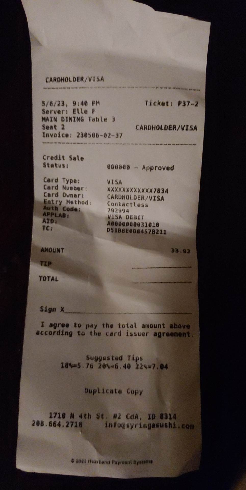 Read moreWe arrived right at their opening time of 11:30am today (Friday). We sat in a section toward the back and were greeted with menus pretty promptly. The server took our orders in the order of which we sat ourselves, with the two booths behind us ordering first. We didn’t order anything to drink and were ready with our menu selections on the first time she came around. We placed our order at 11:36. We chose one of our usual Syringa favorites (Spicy Tuna Sashimi), one Steak bento and one Syringa bento. A table of 8 ladies came and sat down next to us after we had put our order in. Our sashimi and soup came out shortly after we ordered. And then we sat and sat and sat with empty plates and empty waters. The two booths behind us got multiple orders of sushi and entrees delivered to their table shortly after they ordered and THEN, she delivered the ENTIRE tables worth of food to the 8 top that ordered well after us (including some bento boxes) and repeatedly walked past our table without saying a word. Forty five minutes into waiting, she came over and refilled our waters but offered no explanation as to where our food was or why is was taking so long. Our bento boxes were delivered to our table, exactly ONE full ticket time hour, after we placed our order. Zero apology, no acknowledgment that clearly a mistake had been made along the way. Nothing. She avoided us. My husband and I were just starting to eat, as every single table around us, including the 8 top that came after us were paying and leaving. Not to mention that the food was blah and underwhelming. We expect that mistakes can and will happen. That’s okay. What’s not okay, is the way the entire situation was, or rather was not handled. Communication is appreciated. We tipped her the 10% that she deserved and are providing the earned review for...