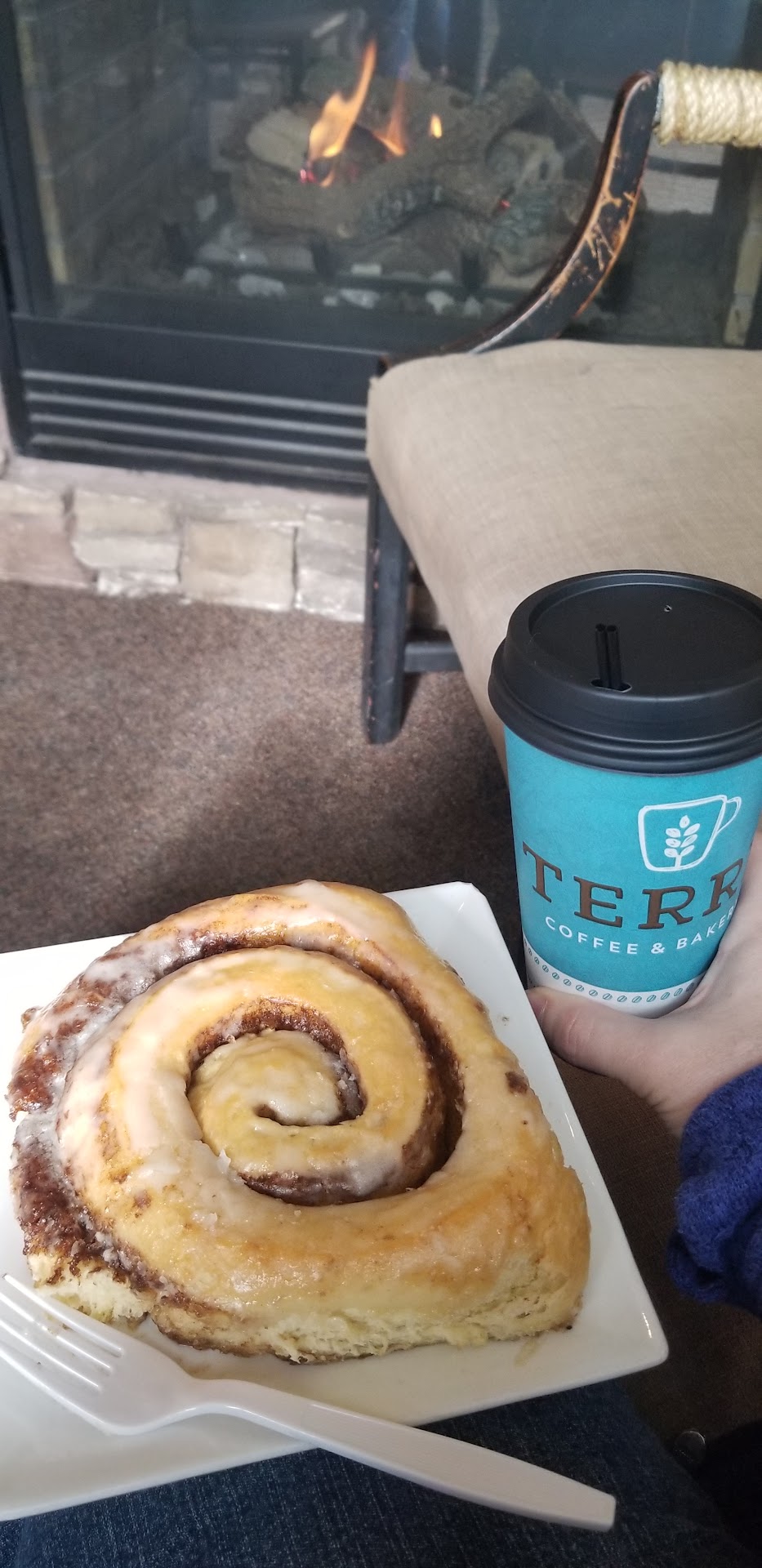 I stopped in for a quick break from running errands and to cash in my free birthday cinnamon roll before it expired. The place has a warm and inviting hotel lobby feel with earthy decor and color scheme.