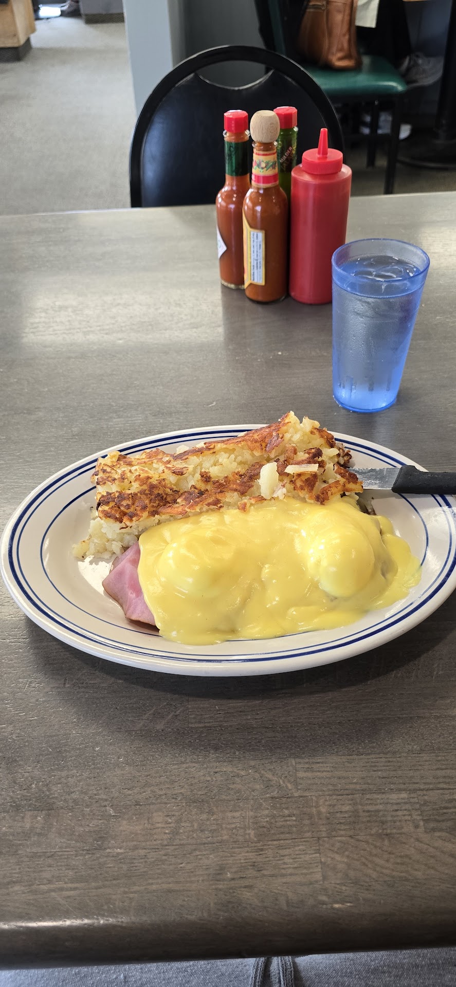 On entering, a waitress cheerfully greeted us and served coffee while we devoured the menu with our eyes...so many choices 😀 Biscuits and gravy, egg scrambles, pancakes, waffles, french toast, omelettes, and it's totally cool to order off the lunch menu if slamming down a 10 oz hot steak sandwich and a pound of crispy taters is your plate of breakfast!