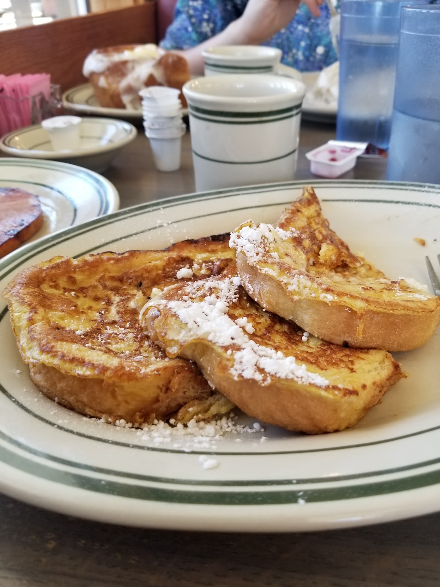 We ordered the biscuits and gravy, eggs and sausage, omelette, french toast, and cinnamon roll. When the food came out, our eyes bulged and stomachs cringed as our nostrils quivered in delight. This is living, this is life! With sweet rolls the size of loaves, omelettes bigger than bricks, and a sausage patty that makes a hamburger patty look like, well, a sausage patty. 😉