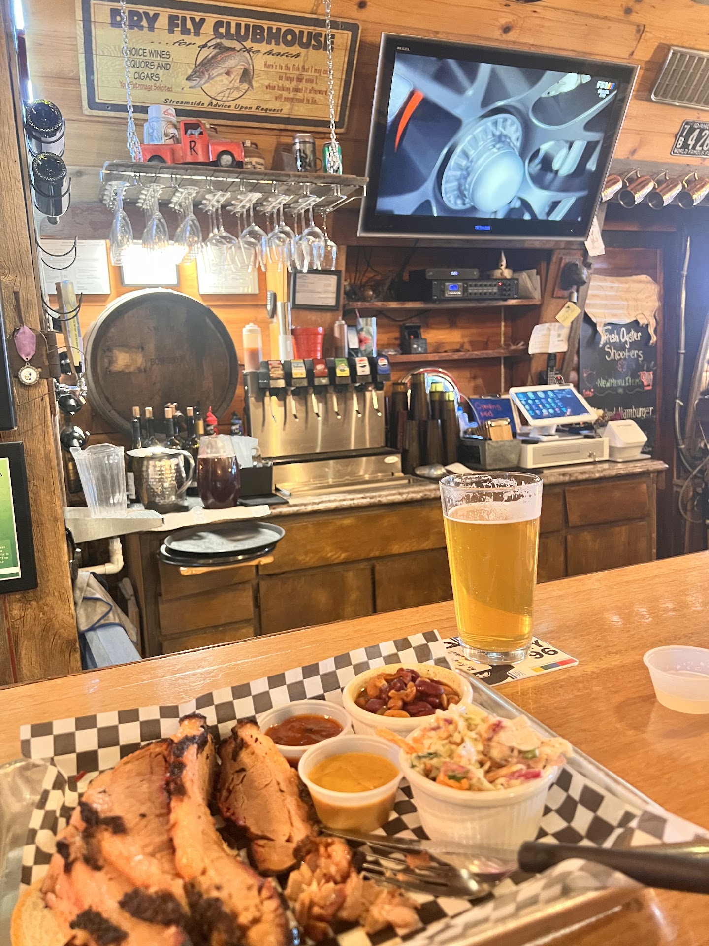 The prices on Google are false, today June 2025 everything was 5-20 dollars more than advertised. The food had no flavor, the brisket had to be cut with knife it was so dry it seemed like it sat out too long it was a bit cold. You don't get to pick the sauce you want, at least not if you've never been before like us. The baked potato was disgusting, the skin was stale like an over microwaved potato, and the smoke they used was disgusting, the sour cream that comes with it was just pure liquid and grainy. We didn't get waited on till 30 minutes of us sitting at our table unable to hear each other because the person that was playing live music had it so loud you can't hear each other or talk. Then after we finally get waited on we get drinks and the lady told us they had Pepsi products and when my husband tried to order a mountain dew they said they didn't have that only Pepsi, starry, root beer and something else I couldn't hear (so clearly you have Pepsi but you do not infact have Pepsi PRODUCTS). The only beverages they have listed on their menu is alcohol or mocktails. After we placed our order is was an hour before we got our food and 45 more minutes of loud music, which we were forced to give a request from a guy who had a dog with him by slamming a pad and pencil on our table. So when we did we gave them a $5 and put in a request. The person playing the music said they couldn't find it, then the group sitting with the guy with the dog found it and he tried for 2 seconds then said he couldn't and skipped us and still kept the tip. All the while my husband had finish their drink and the ice had melted in that hour of waiting for our food. The waitress had told us it was because a big order got placed and that took priority. When we did finally get our food I asked if my husband could get a refill and she brought over these other cup with drinks and no ice and then used them to pour the soda into our previous cups, I had no problem with this, however the ice in my husband's glass had already melted and she just poured the drink into it instead of at least dumping the old ice and getting fresh ice. And then we were given hour food finally but there was no flavor and it all tasted old. My husband ordered the smokey Mac n cheese and it was over done and tasted left to sit with cold cheese grated over it. I do not recommend coming here to eat it's not a very good experience and too expensive for what you get. Not only are the Google prices wrong but so are the picks of the food, it's much smaller amounts. Will not...