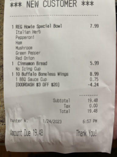 Read moreGood food although they tell me 45 to 50 min for delivery its now been an hr and a half and still no food so we're all sitting here getting hangry not to mention ordered a pizza came wrong twice let's see if the get it right this time this is now an edit from earlier finally got our food an hour and 45 minutes and I honestly feel sorry for the driver poor guy had to deliver 6 orders by the time I got my food it was all cold and rubbery managed to get my one pizza right guess the 3rd time really is the charm but I'm pretty sure hungryhowies has lost our...