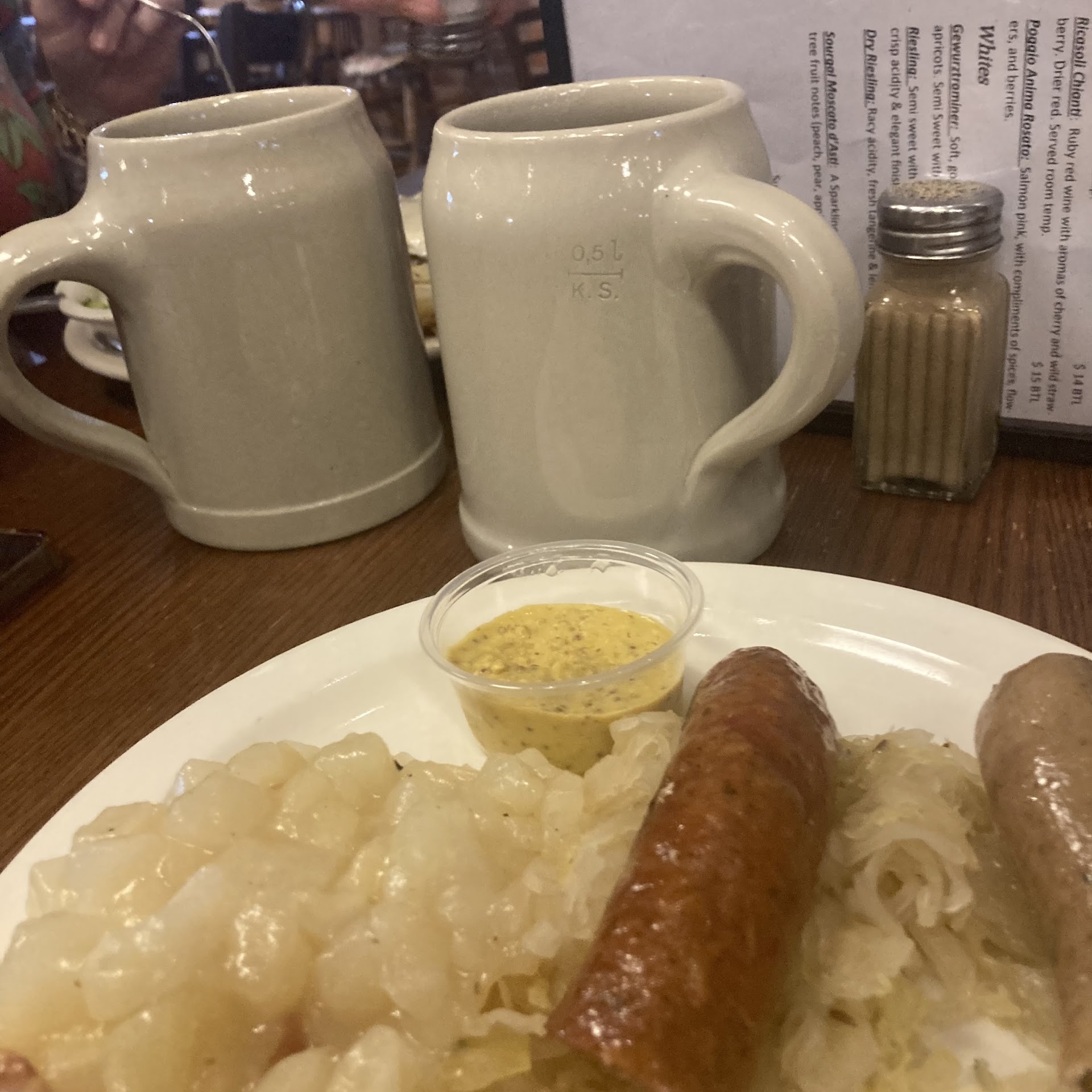 The menu is relatively simple. Several choices of Wurst (German Sausages) or Schnitzel (Meat thinly pounded and fried), with traditional German sides like German potato salad (a sweet potato salad, wich is what I had, and didn't realize it was going to be sweet, didn't like) and sauerkraut.
