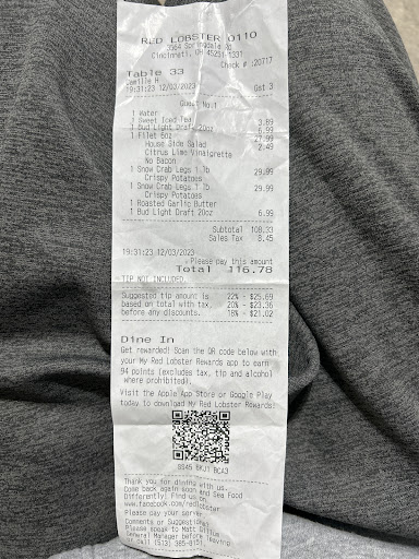 Took my wife to this Red Libster last night for her birthday dinner. We are both Red Lobster fans. We are from Arizona and enjoyed them out west so naturally we sought them out here in Cincinnati. Being a franchise one assumes that they will likely be good if one is they should all be alike, right. Well, with this restaurant we were wrong. The one at 3564 Springdale in Cincinnati was not good it was GREAT! Although we have reasons that make us eat early we don’t like to drive after dark. Upon being seated we were immediately were met with a friendly server asking for our drink preference. We ordered iced tea and no hors d’oeuvres, and an older couple it usually means cheap meal and small tip. Additionally I said to her we were in sort of a hurry. She didn’t miss a beat handled us with the courtesy of cherished client's and saw to it our orders were delivered promptly and piping hot. She returned every few minutes wanting to know if everything was okay and could she bring anything. I gave this restaurant five stars because it deserved them. The food was delicious. Piping hot and served quickly as requested. The service got five starts because I could not give it six stars. Our server was that good. I cannot say too much about the place, both the food and the service. My apologies as I neglected to get a photo.