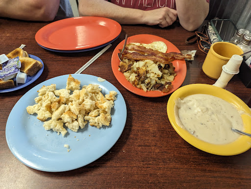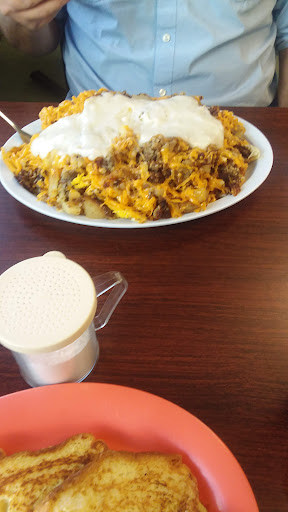 Today was my family's second visit in a month. The first time, we showed up after 10. The menu does not indicate a time-frame for certain items, other than no pancakes after 11. My wife ordered a burger, and I ordered an "Old Man's Dirty Diaper." But they were out of chili, so I opted for a "Smelvin Wrap." Overall, the food was good. My son had a pancake that was burnt on the bottom, but they replaced it. We left a 20% tip.