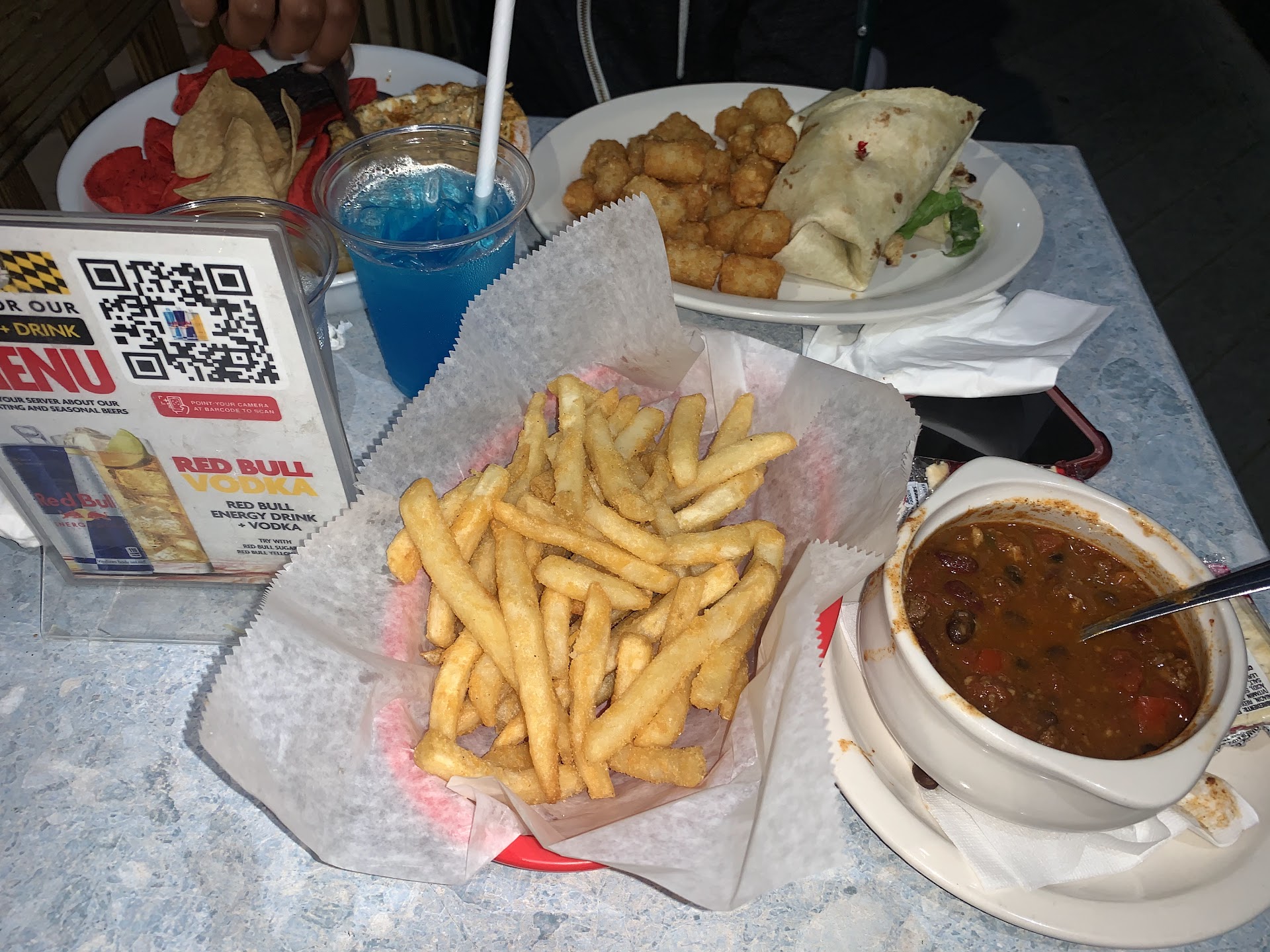 Where to start..if I could give zero stars I would. If you’re looking to go to a restaurant/bar just for conversation this is the place for you! My bf and I arrived and we were seated without a menu and had to grab the servers attention to get a menu. We ordered all of our food at once, the drinks, appetizer, and entree. My “sandwich” and his burger had the option of tater tots, fries, salad, or onion rings. None of these options were given to us. We had to flag down our server to let her know I wanted onion rings and he wanted tater tots. Our drinks arrived at least 30 minutes after we sat down, one was a simple mixed drink and the other was a watered down lemonade. We weren’t given any waters like the rest of the tables around us nor were we given any update that our food was going to take an hour to get to our table. When the food finally arrived it was all wrong. The burger my bf ordered did not have any chili on it as requested and I was given a Cajun wrap instead of a Cajun sandwich. When we told our server about my sandwich her response was she thought she heard me say Cajun wrap...my bf ordered everything for us..I only requested no tomato or onion. When we asked about our appetizer we were told it was never put into the system. Overall on a good point my bf’s burger was corrected, I got my sandwich, and thankfully the check was keyed in correctly. In regards to all of the foods taste..the onion rings were pretty good.. This place has pretty good drinks and a nice atmosphere they just lack in service NOT including one of the male servers (that did not cause any of the problems listed above) there that came to check on us every...