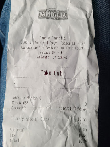 While traveling through Atlanta International airport last Monday evening (02-03-2020 8:30 PM), I visited one of your restaurants in Terminal D. This location had about 4 slices of pizza randomly placed on the counter along with a couple calzones. I inquired if they had any in the oven coming out soon. The employee said, "in 12 minutes." So I took a seat to wait. About 15 minutes later the employee put pizza in the oven. In the meantime about 20+ potential customers came up to see what was available. Most walked away. All employees were complacent and did very little to even acknowledge any approaching customers. Finally after 30 minutes the employee removed a cheese pizza. Apparently a customer had prepaid for a slice, she approached and said she had ordered a pepperoni slice. So he cut a piece of cheese pizza, stuck 4 pieces of pepperoni on it an put in in the oven. Then proceeded to remove an entire pepperoni pizza out of the oven, reached in to take her slice out. She said she would rather have pizza from the actual pepperoni pizza just removed from the oven.. Without a word, he took the slice he added pepperoni to and literally chunked it into the trash. She did not seem well pleased. A few customers came up before I got to the counter and ordered a couple slices from the freshly made pizza. There were two pieces left when it was my turn to order. I ordered one slice, the employee could not cut it with the pizza wheel so he jabbed his fingers into the slice to separate the two pieces. Not too appealing. I went to pay and they did not take cash????? I saw about 4 different employees milling around, mostly in the back during my observations there. None greeted customers nor did they seem to give a sh%#. A terrible first impression...