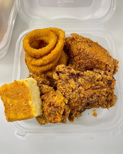 Their 4 Piece White (bone in fried chicken drizzled with honey Old Bae, Onion Rings, & cornbread $16.99). STAMP the chicken!! The drizzle sweet, but savory.