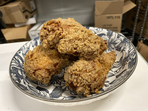 As some other reviewers have commented, the chicken is perfectly seasoned - not just the breading, but the meat itself. My guess is that they brine the meat overnight, probably in yoghurt/salt to tenderize it. The breading is fantastic and stays on the meat. It's well seasoned too, slightly spicy and tangy, but not in an overbearing way. It's a unique experience different from just about any other fried chicken I've tried.