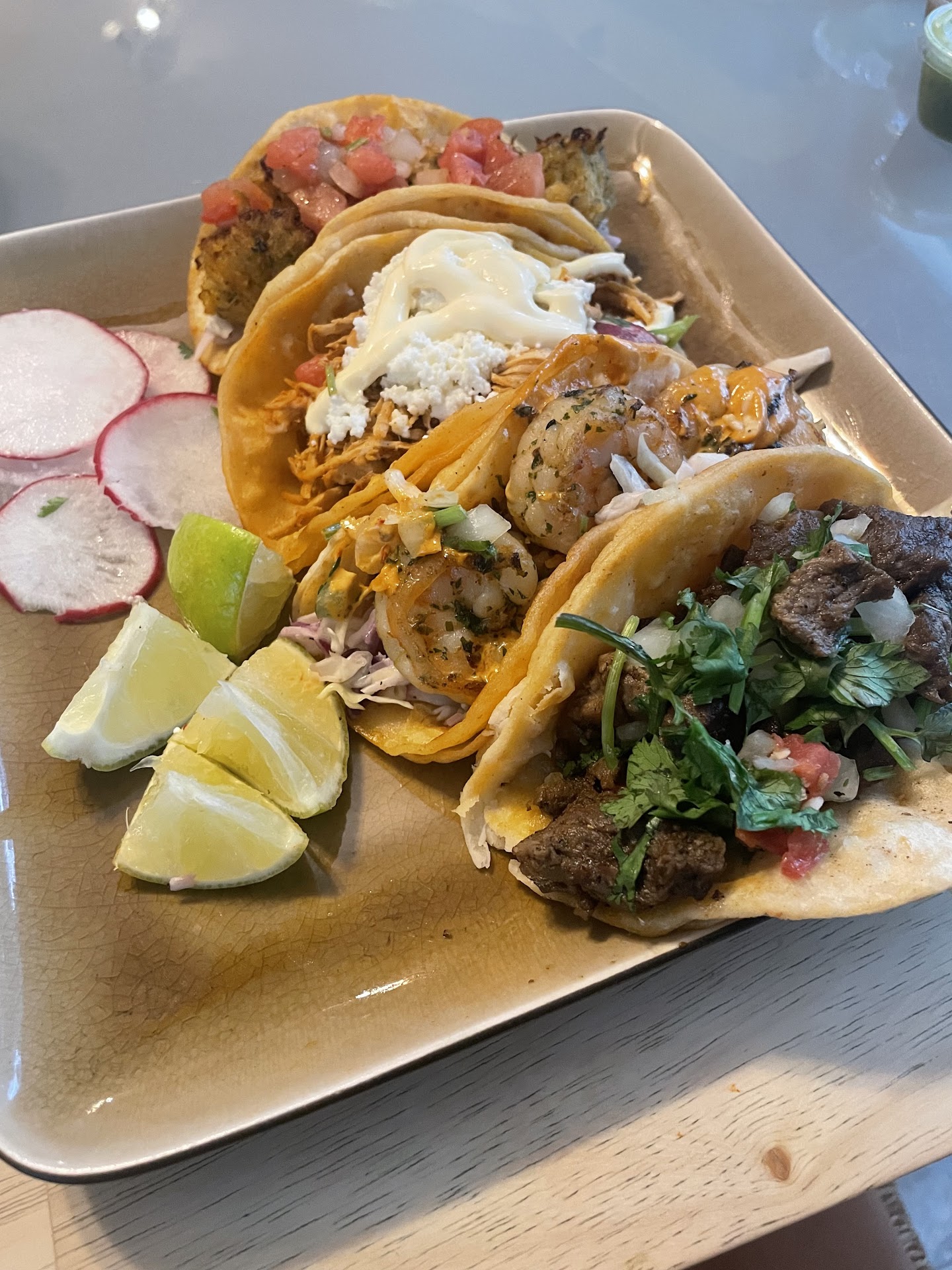 I ordered some tacos to go online (carne asada, crab cake, spicy chicken tinga, grilled shrimp + a side of guacamole).