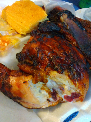 Chicken- seasoned with a barbecue dry rub that was smoky and slightly sweet. The bird was juicy not burnt or dry and had a smoke ring. Dipped in either sauce it was good.